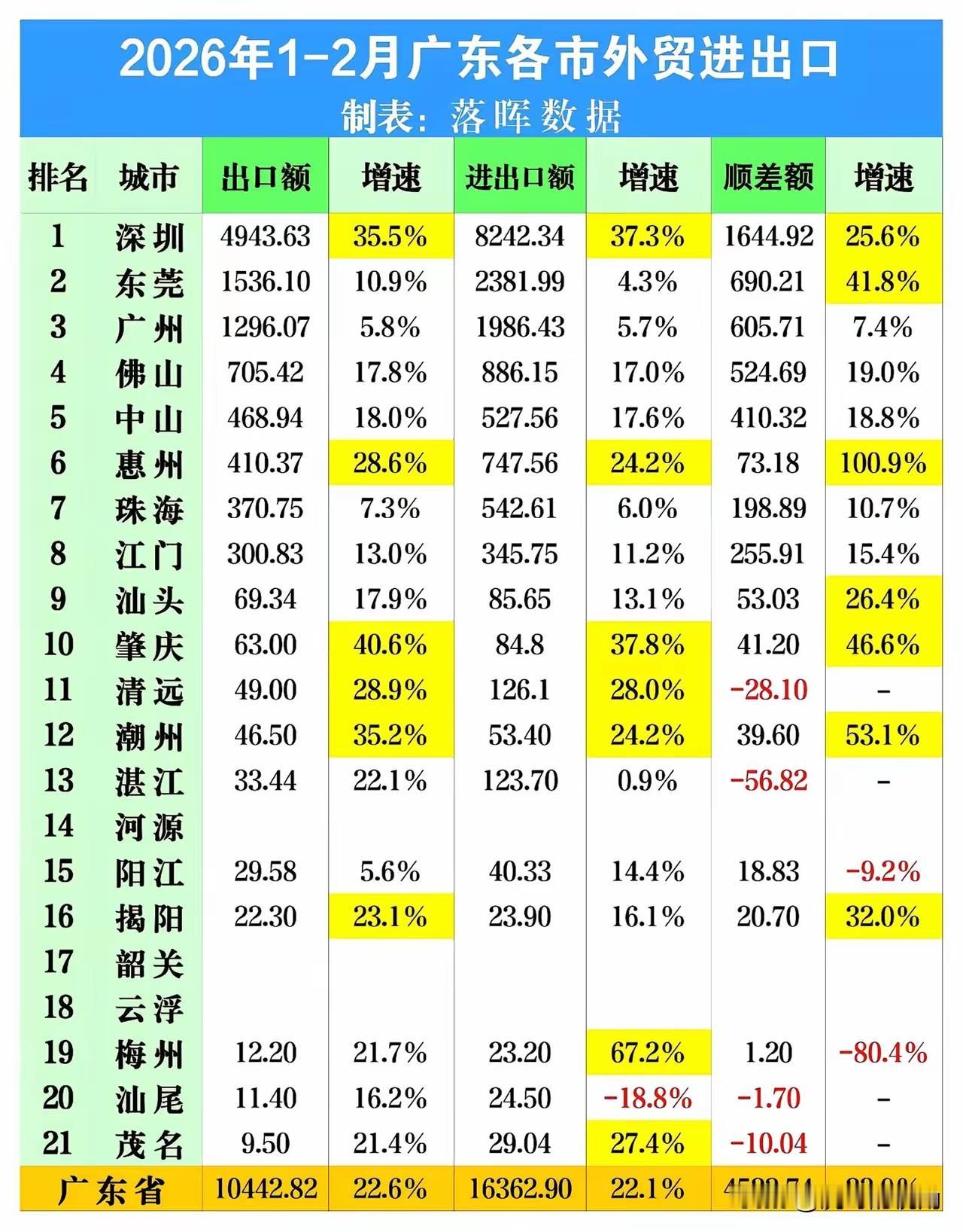 从外贸顺差情况来看,惠州的增速竟高达100.9%。尽管其顺差额与出口额排名前一位的中山相比差距较大,但这一增速着实令人惊喜。外贸排行 出口量排行榜