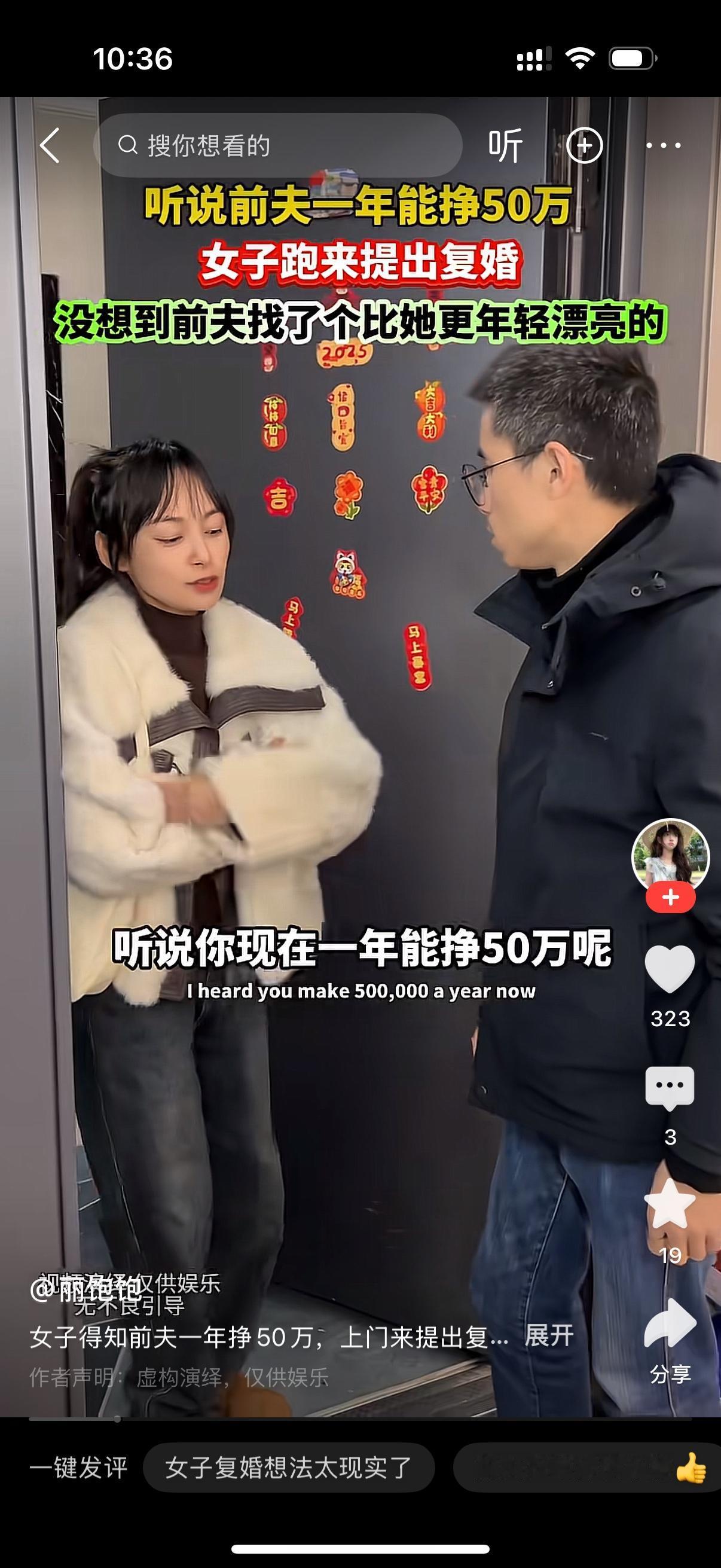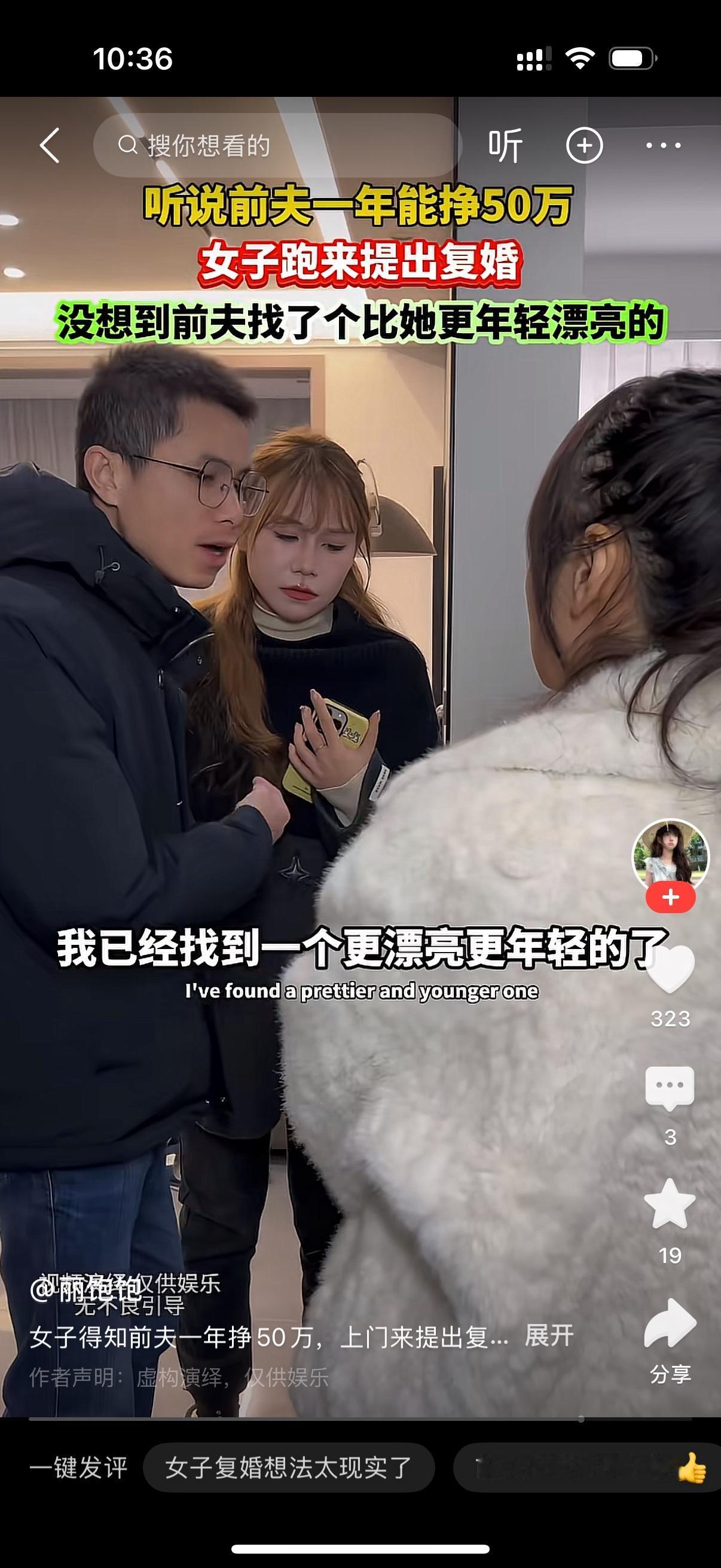 前妻找上门对前夫说,听说你现在一年能赚50万。前夫冷冷地说,跟你有什么关系?前妻理直气壮地说,反正我还没有再婚,咱们复婚吧?这个时候,一个女人从屋里走了出来。前夫指着她对前妻说,我已经找到一个更年轻更漂亮的了。前妻瞬间受到了侮辱,脸都绿了。