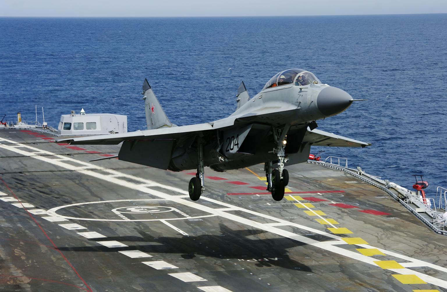 MiG-29K战斗机是多功能全天候舰载战斗机,机载设备得到进一步改善。该机配备的“甲虫”型多功能雷达,可进行方位角电子扫描,雷达搜索距离达100千米。该机还配备有重量很轻的头盔瞄准具、惯性导航系统和仪表着陆系统等。为了增大航程,机上还配备有空中加油系统,其空中受油管安装在驾驶舱左前方。驾驶舱的视野也得到了改善,内部配置有零一零弹射座椅,紧急弹射时可自动避开航空母舰上的舰岛。