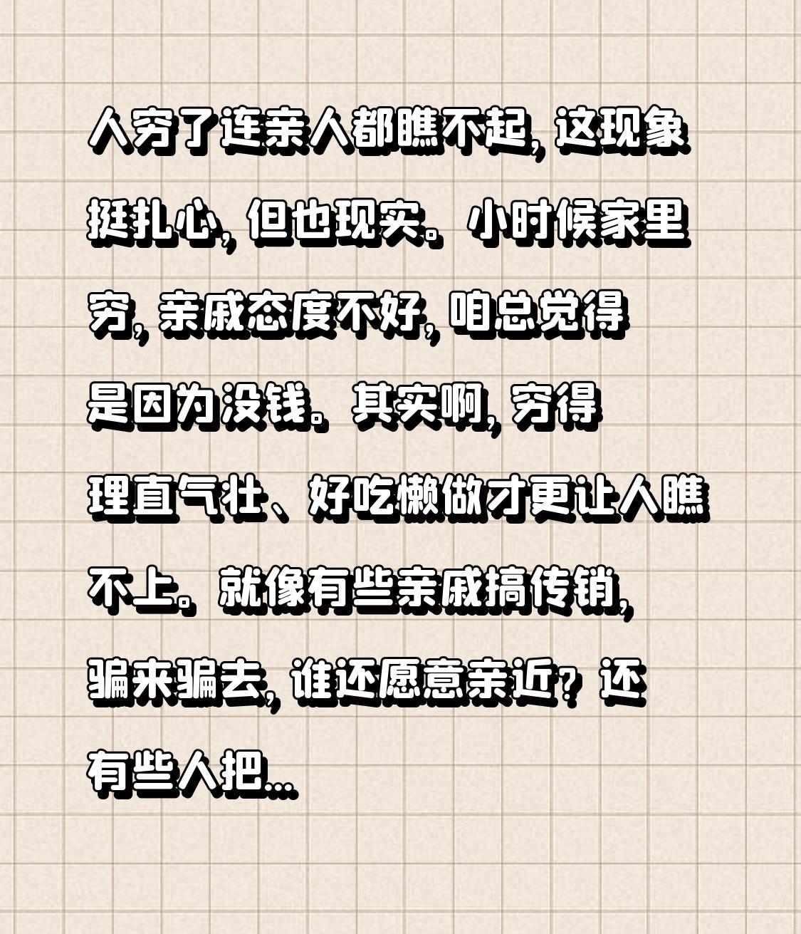 人穷了连亲人都瞧不起,这现象挺扎心,但也现实。小时候家里穷,亲戚态度不好,咱总觉得是因为没钱。其实啊,穷得理直气壮、好吃懒做才更让人瞧不上。就像有些亲戚搞传销,骗来骗去,谁还愿意亲近?还有些人把“亲近”当借口,伸手要钱积极,出力时不见人影。