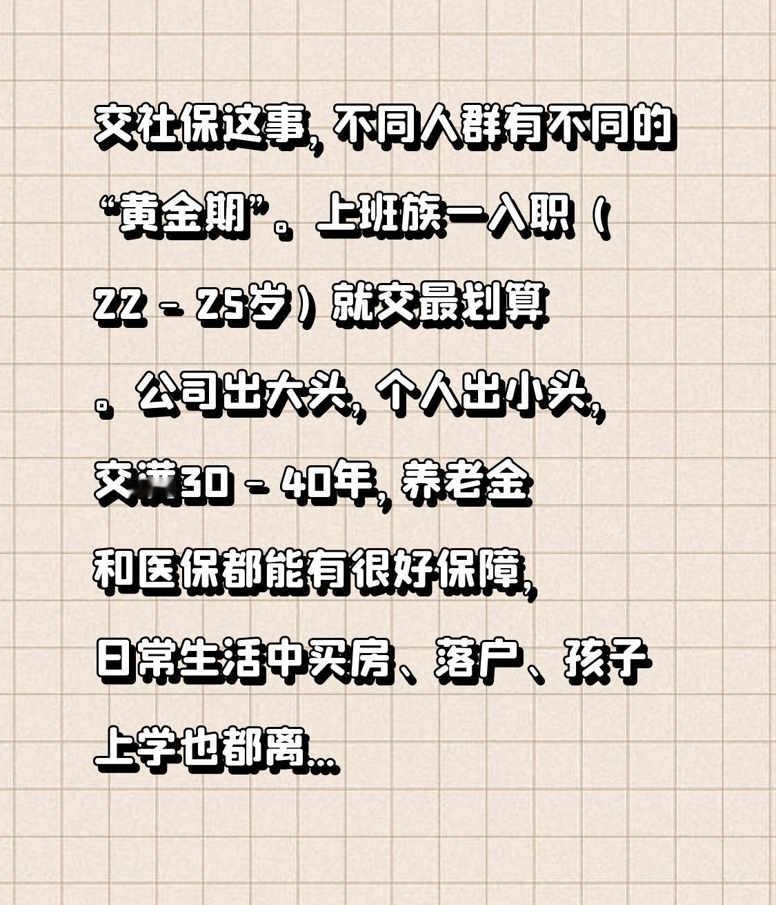 交社保这事,不同人群有不同的“黄金期”。上班族一入职(22 - 25岁)就交最划算。公司出大头,个人出小头,交满30 - 40年,养老金和医保都能有很好保障,日常生活中买房、落户、孩子上学也都离不开社保年限。