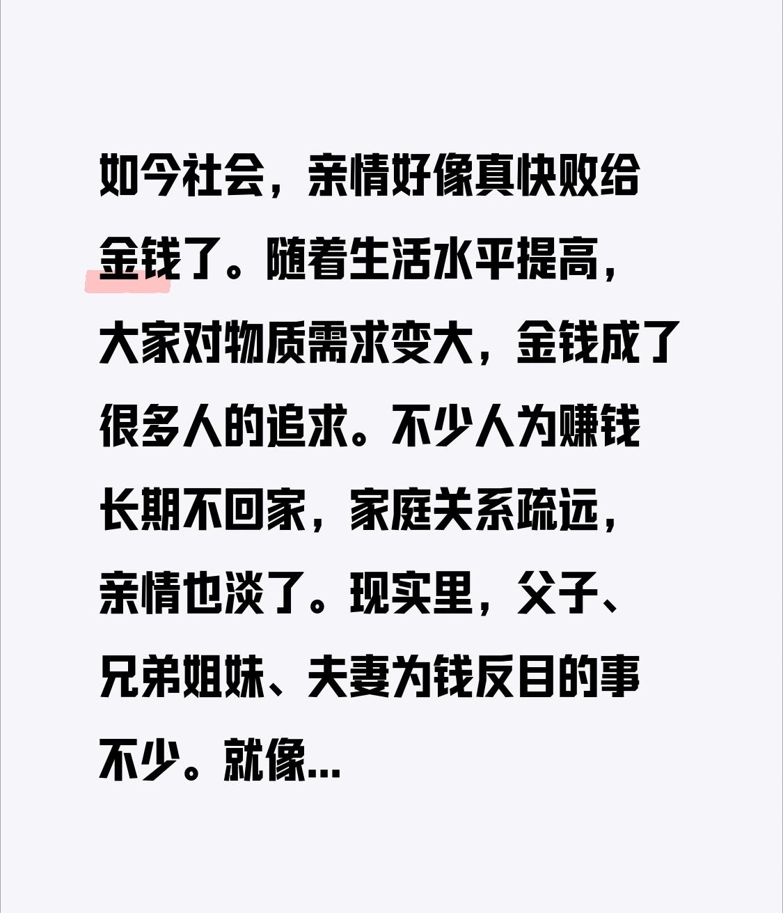 如今社会,亲情好像真快败给金钱了。随着生活水平提高,大家对物质需求变大,金钱成了很多人的追求。不少人为赚钱长期不回家,家庭关系疏远,亲情也淡了。