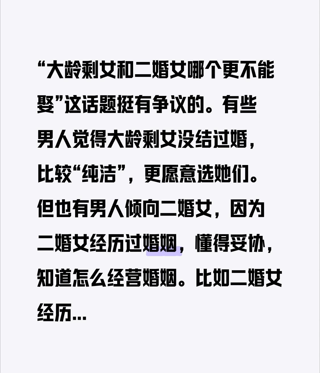 “大龄剩女和二婚女哪个更不能娶”这话题挺有争议的。有些男人觉得大龄剩女没结过婚,比较“纯洁”,更愿意选她们。但也有男人倾向二婚女,因为二婚女经历过婚姻,懂得妥协,知道怎么经营婚姻。比如二婚女经历过矛盾、争吵,会把第一段婚姻的教训用到第二段婚姻里。