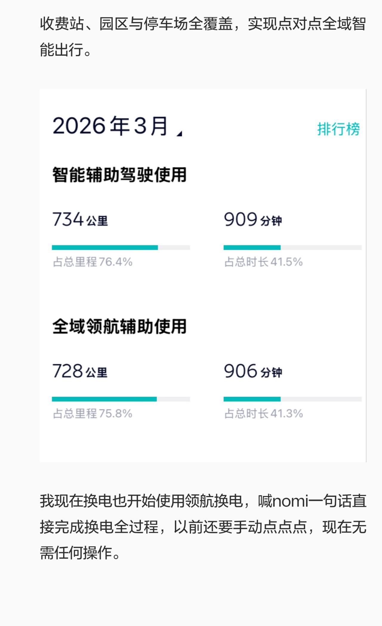2026年3月,蔚来智能辅助驾驶使用总里程超过1.5亿公里,相当于又绕了地球近四千圈。自从蔚来世界模型升级到2.0后,蔚来智驾真正做到了全场景好用,城市道路、快速路、高速、换电、收费站、园区与停车场全覆盖,实现点对点全域智能出行。我现在换电也开始使用领航换电,喊nomi一句话直接完成换电全过程,以前还要手动点点点,现在无需任何操作。日常通勤从家到公司,从启动出库、路口转向、避让超车到上下匝道、自动泊车,全程都能放心交给它。周末长途出游,它还能智能变道、远离大车、从容进出匝道,驾驶从容又省心。