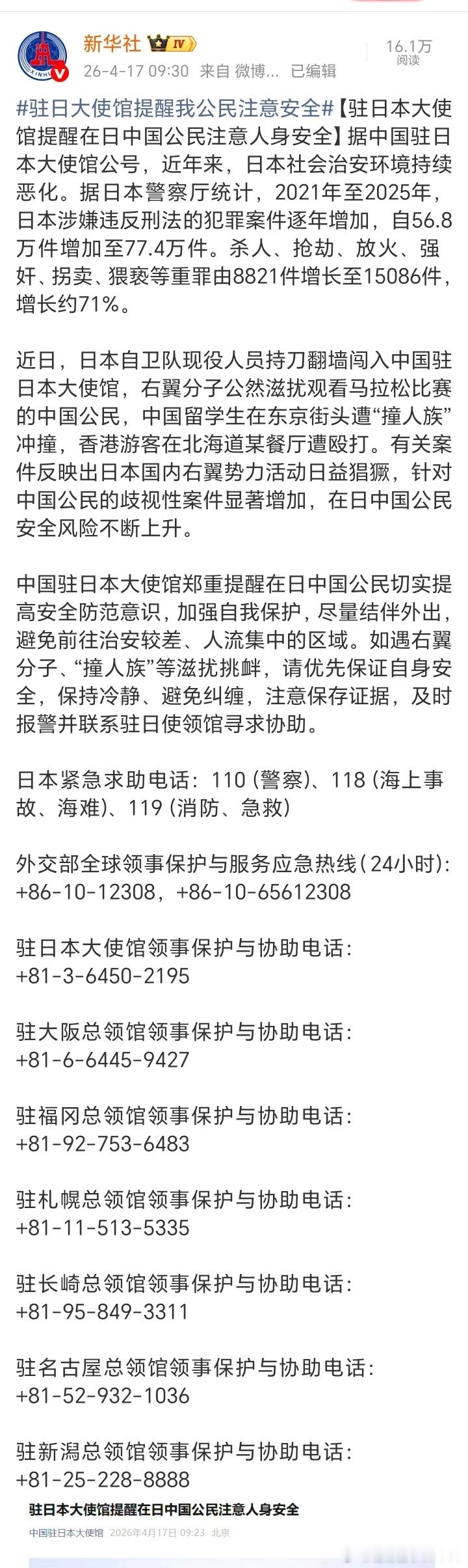 驻日大使馆提醒我公民注意安全【驻日本大使馆提醒在日中国公民注意人身安全】据中国驻
