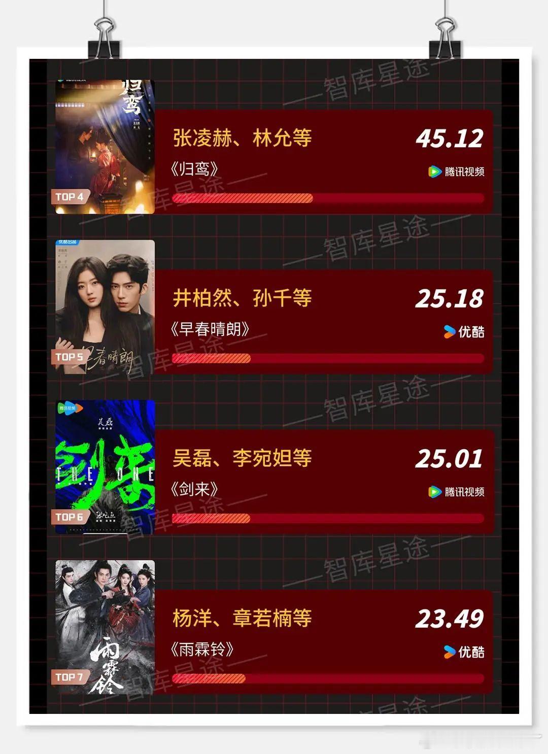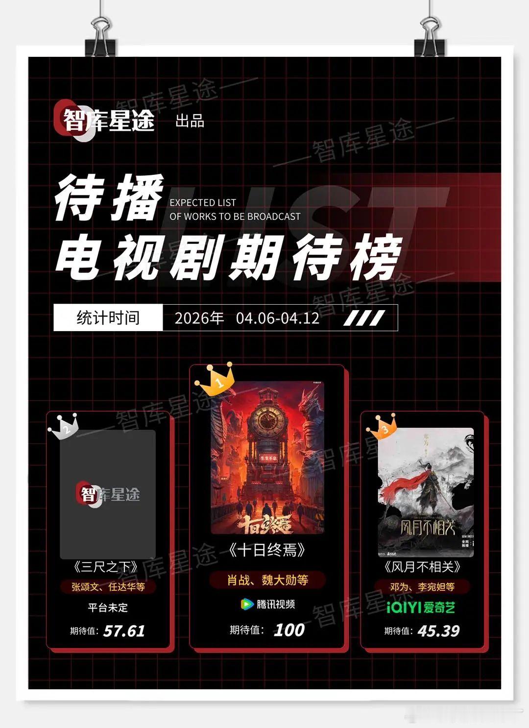 智库星途 待播电视剧期待榜统计时间 2026年0406-0412十日终焉 肖战 魏大勋三尺之下 张颂文 任达华风月不相关 邓为 李宛妲归鸾 张凌赫 林允早春晴朗 井柏然 孙千剑来 吴磊 李宛妲雨霖铃 杨洋 章若楠庆余年第三季 张若昀 吴刚谷雨 井柏然 张颂文将门独后 王鹤棣 孟子义