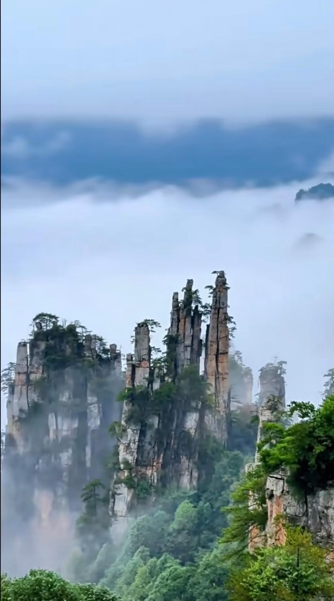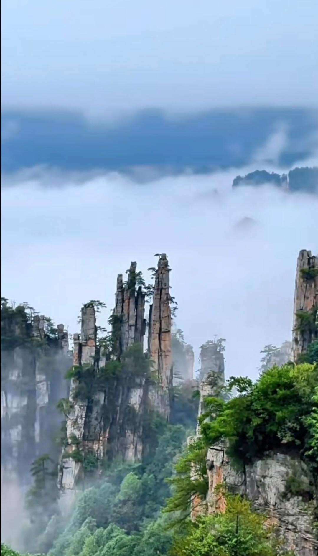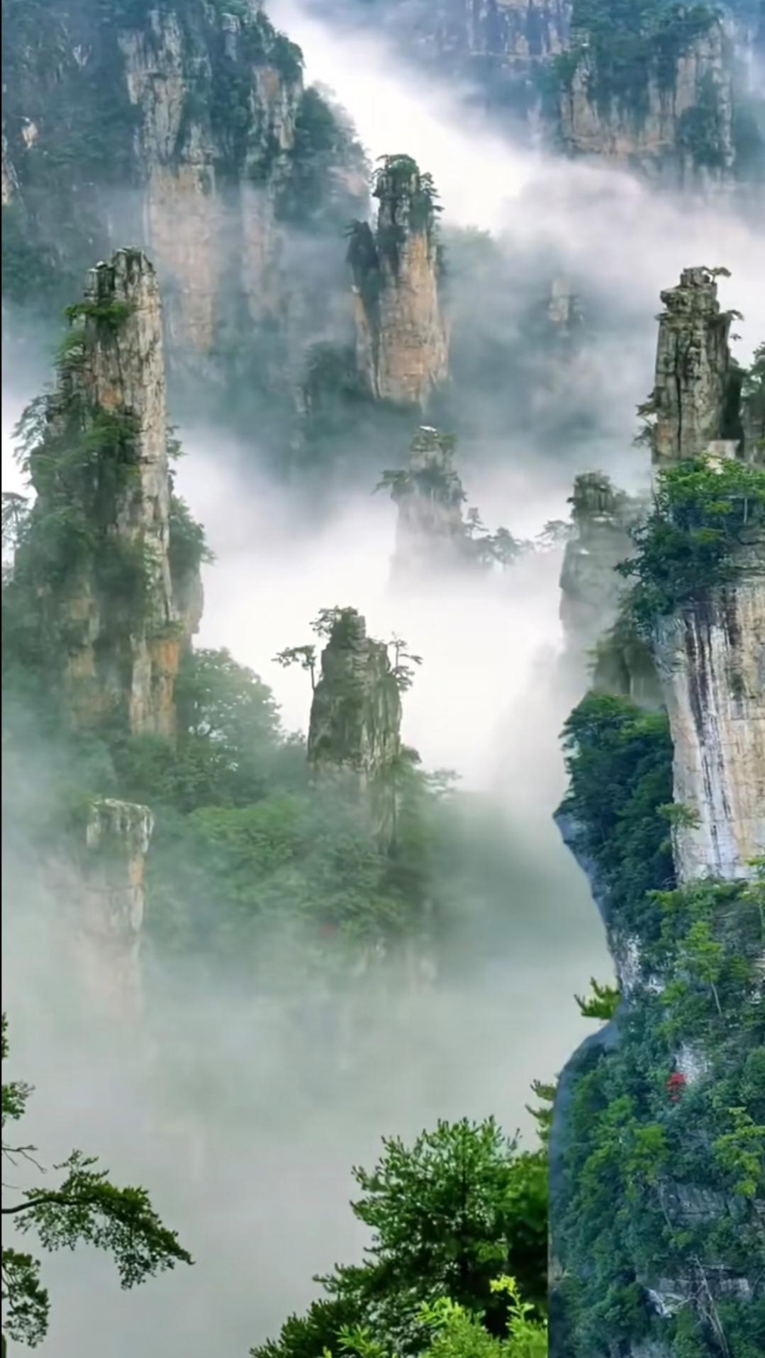 雨后的张家界,更具一番韵味。云雾愈发浓稠,在峰林间肆意翻涌,化作云海,化作云瀑,气势恢宏。远处的峰林在云海中忽隐忽现,似真似幻,仿佛蓬莱仙境,让人恍惚间以为闯入了仙侠世界,心生飘飘欲仙之感。云雾散去时,山峦被雨水洗得愈发青翠,岩壁更显峻峭,空气愈发清新,连枝头的露珠都晶莹剔透,整个森林公园,都透着一股洗尽铅华的清新与灵动。