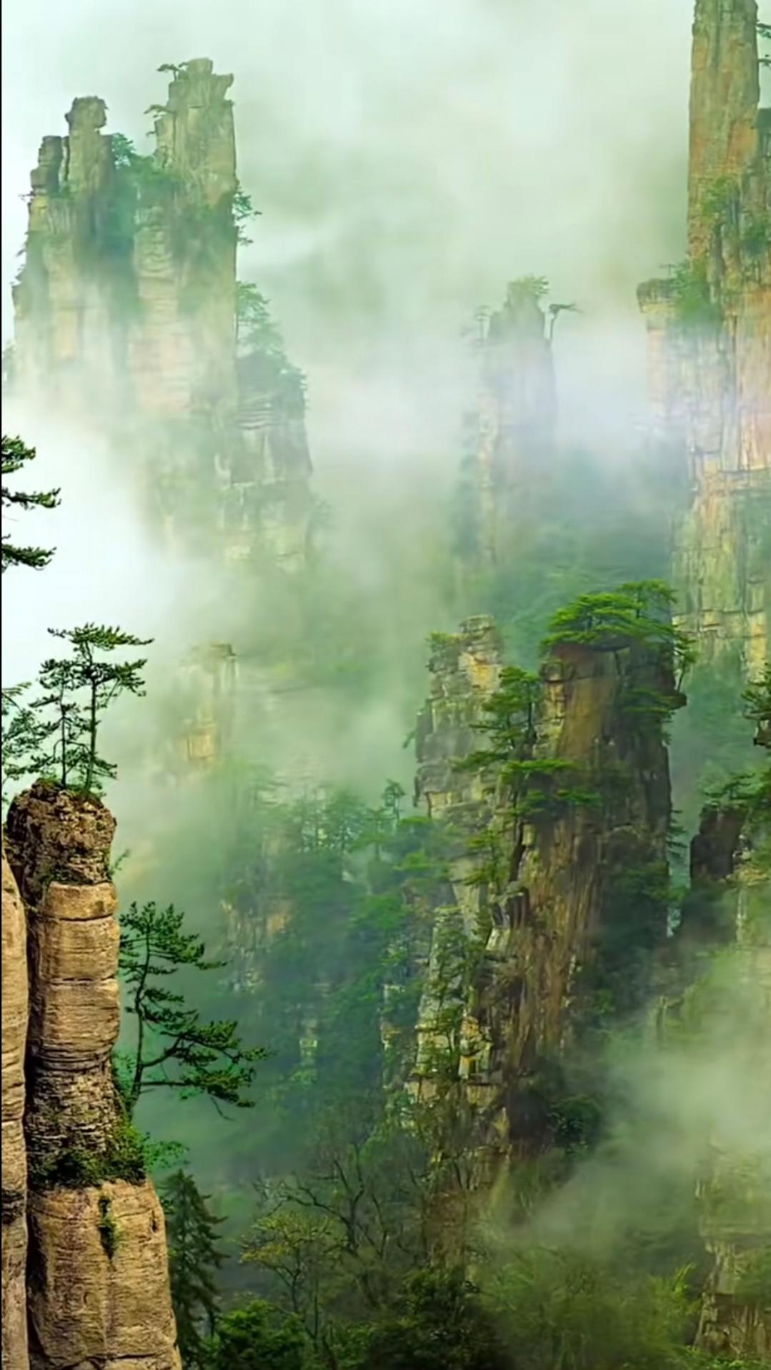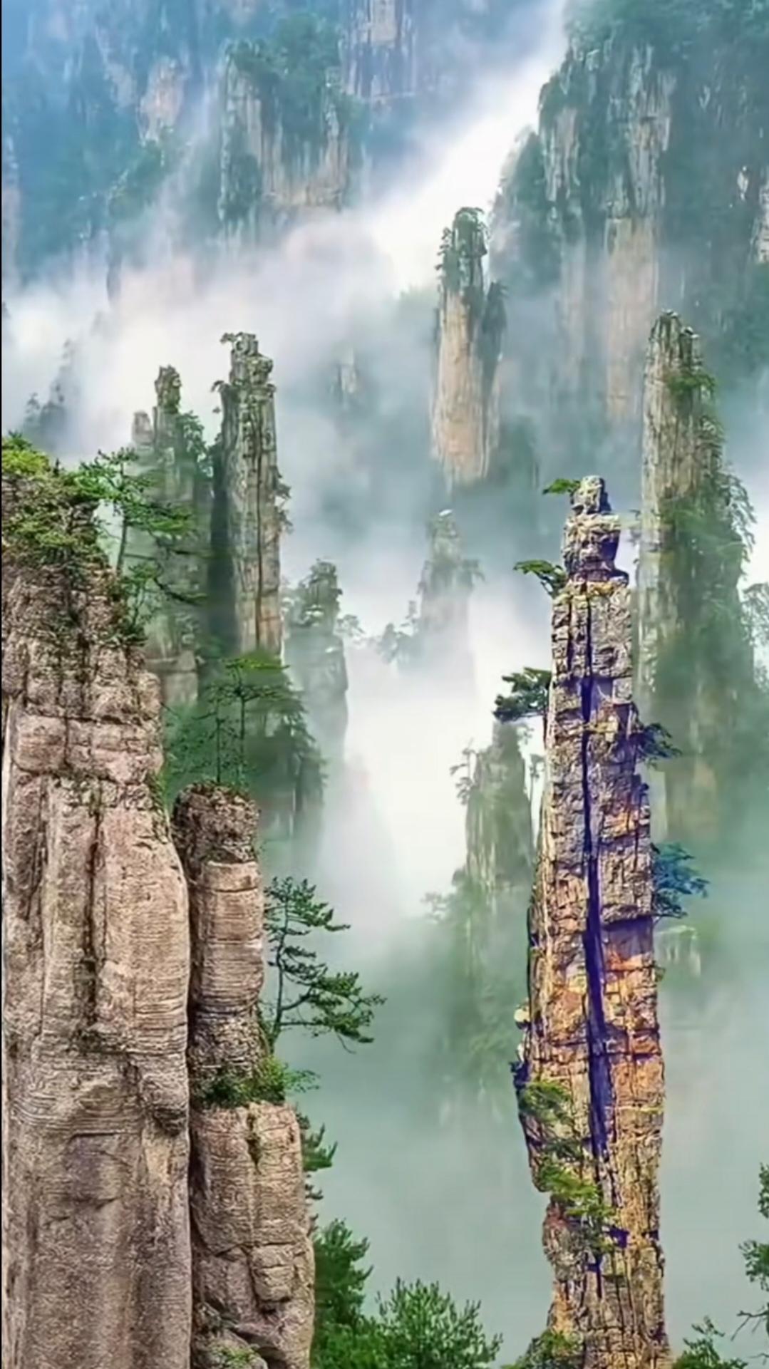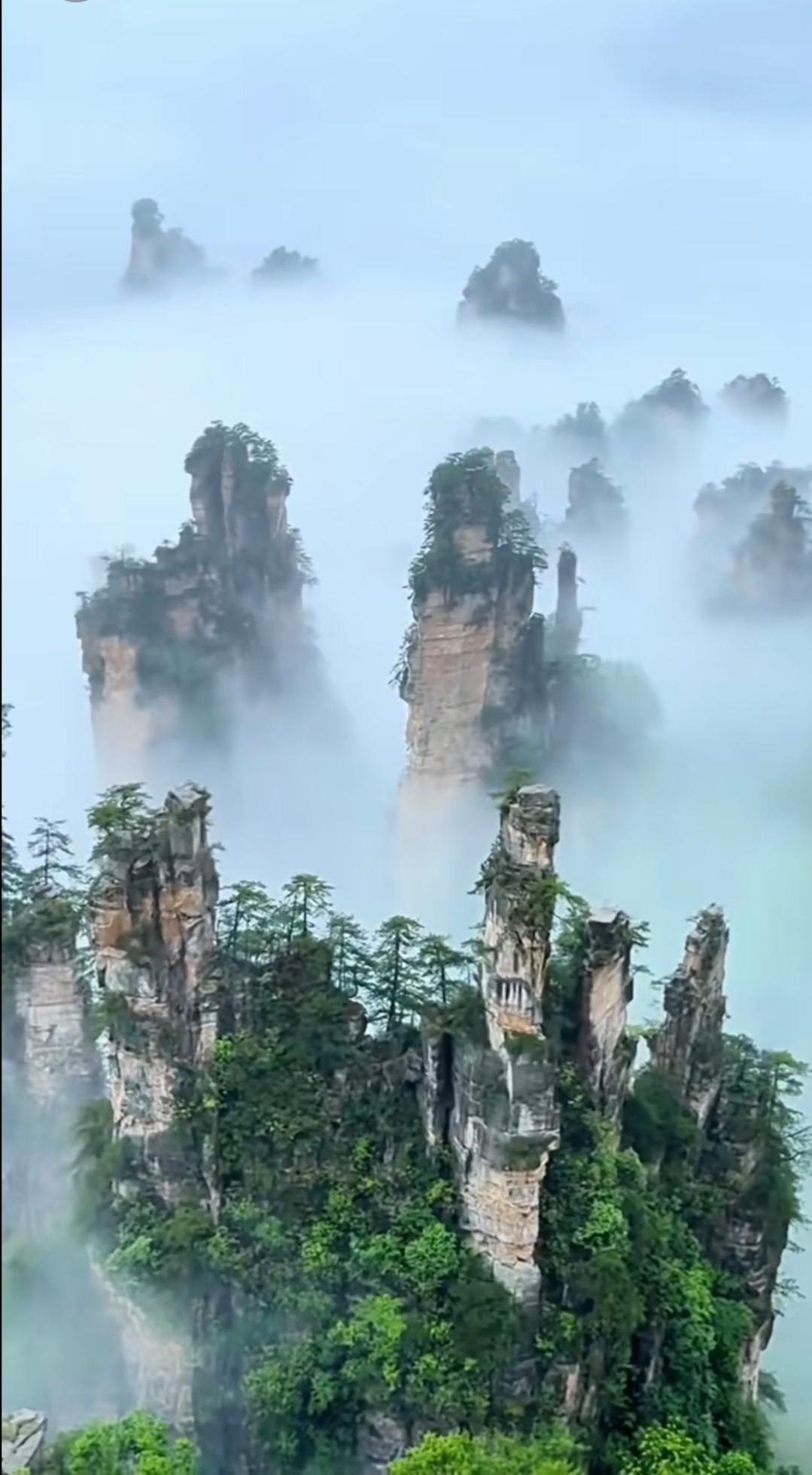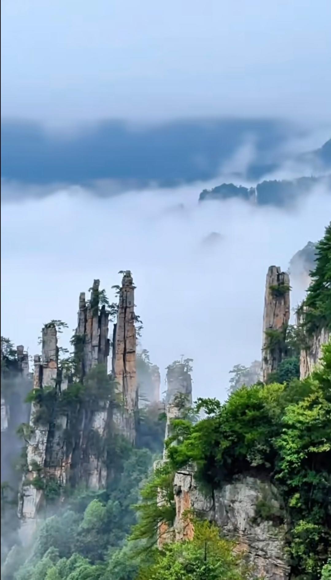 雨后的张家界,更具一番韵味。云雾愈发浓稠,在峰林间肆意翻涌,化作云海,化作云瀑,气势恢宏。远处的峰林在云海中忽隐忽现,似真似幻,仿佛蓬莱仙境,让人恍惚间以为闯入了仙侠世界,心生飘飘欲仙之感。云雾散去时,山峦被雨水洗得愈发青翠,岩壁更显峻峭,空气愈发清新,连枝头的露珠都晶莹剔透,整个森林公园,都透着一股洗尽铅华的清新与灵动。