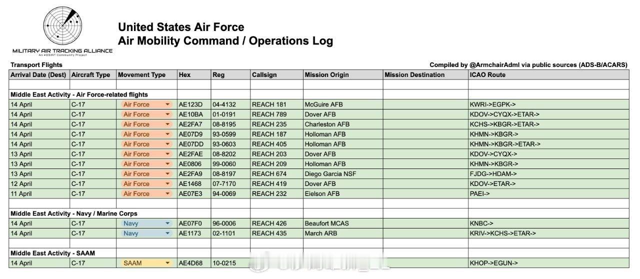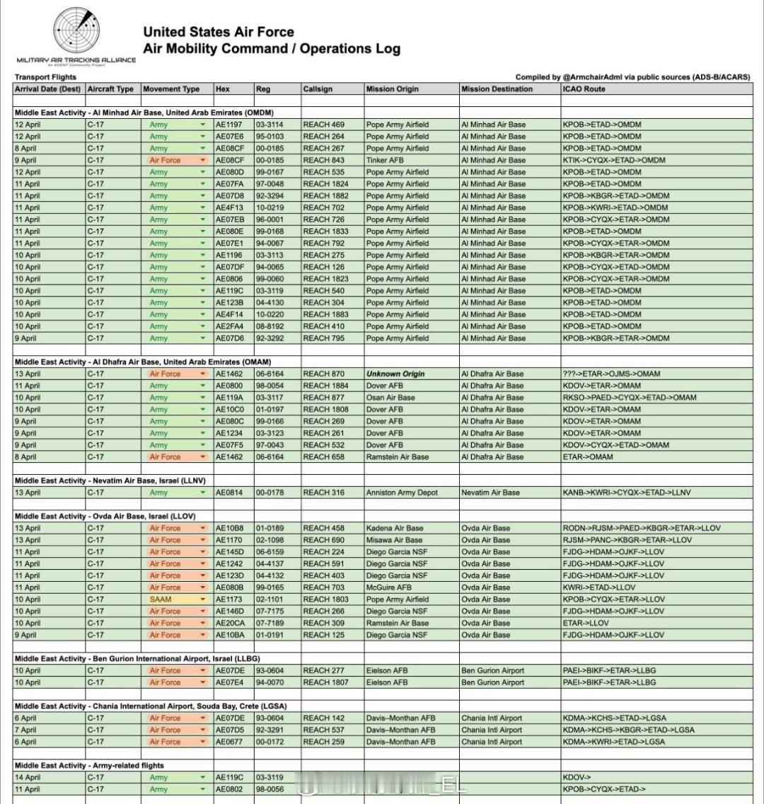4月8日以来,美军已向中东地区执行运输航班73架次。