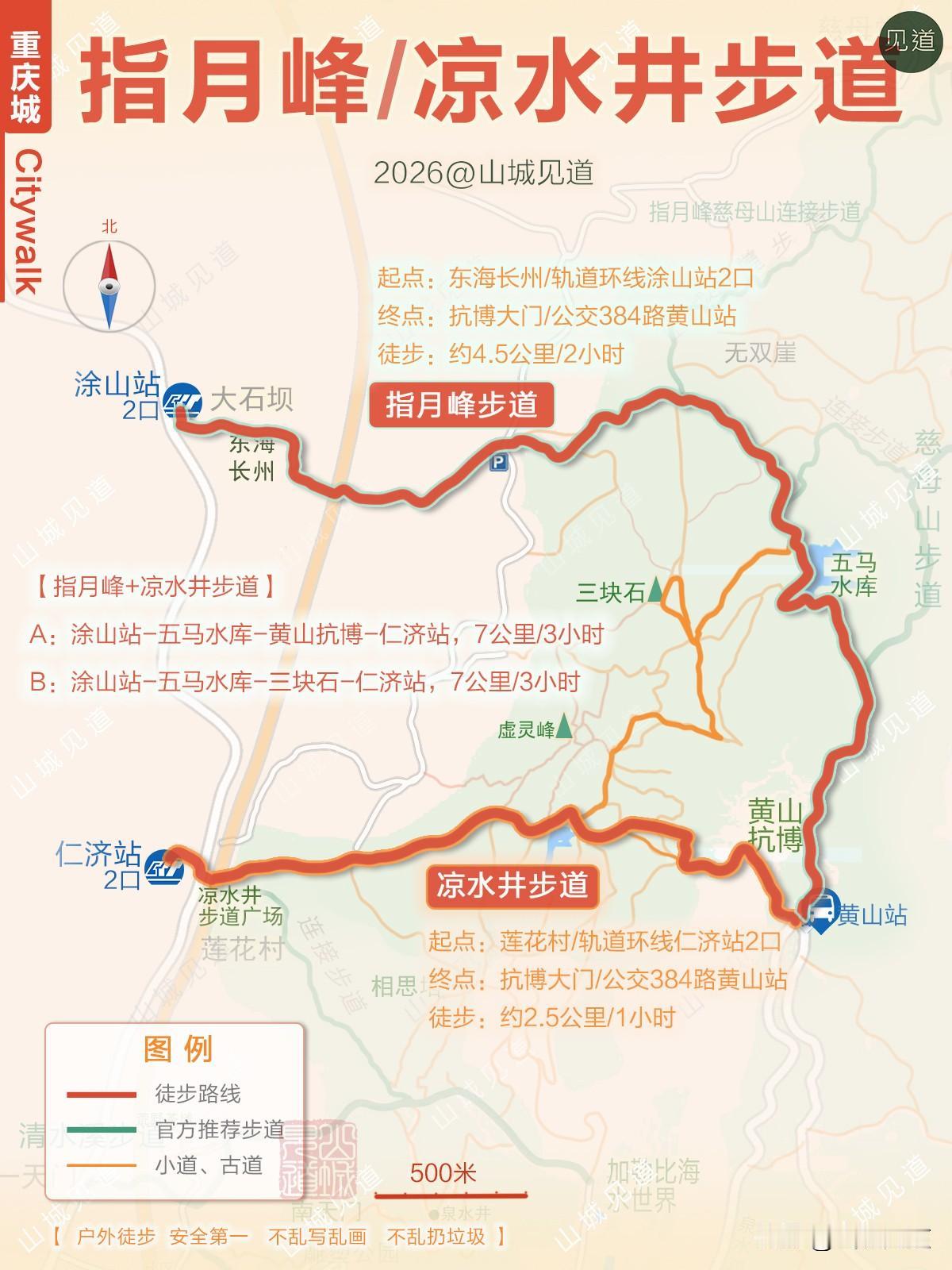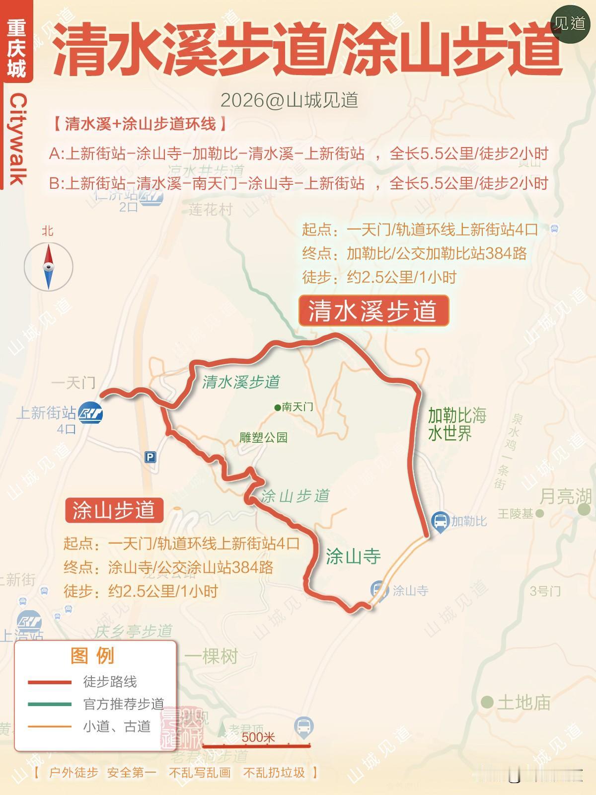 B线:上新街站——清水溪步道——南天门——(涂山寺)——涂山步道——上新街站