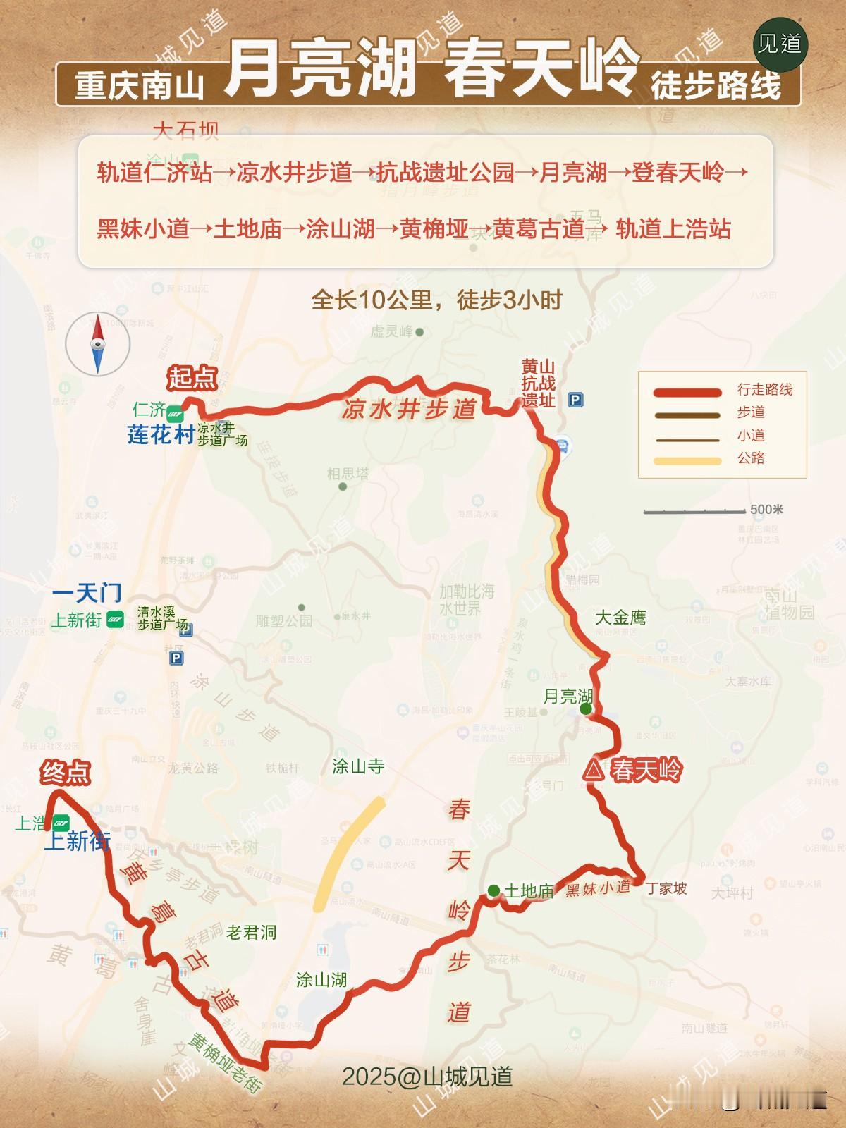 (5)轨道仁济站——凉水井步道——月亮湖——春天岭——春天岭步道——黄葛古道/10公里