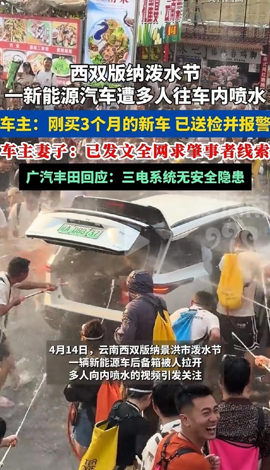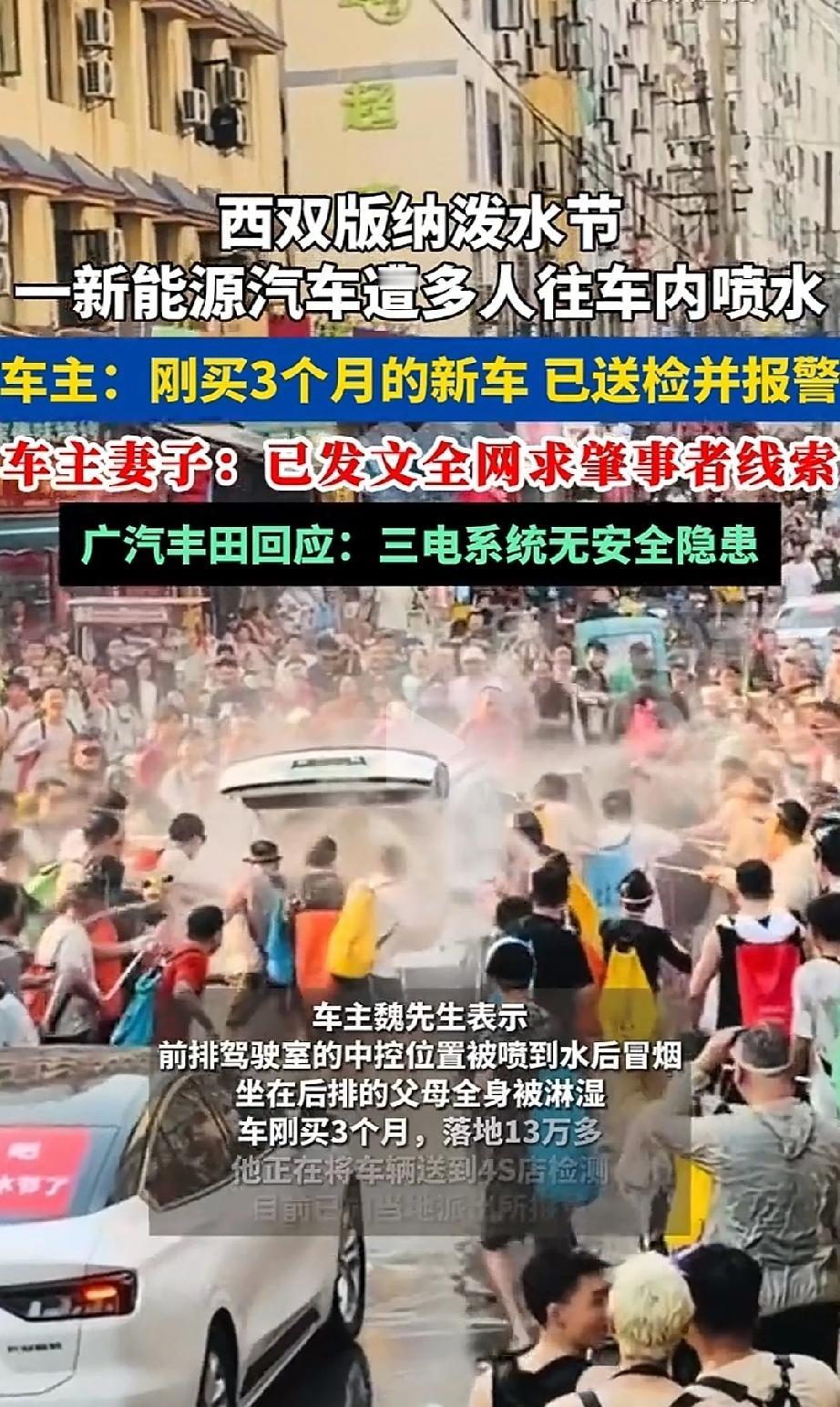 过分了!西双版纳,东北大哥自驾刚买3个月电车去云南过泼水节,开进人群就被围堵,车门、后备箱被强行拉开,连后排老父亲都被淋透车内还冒起了白烟,差点以为要出事!事后官方检测,车辆三电系统完全没问题,免费清洁除湿,还安排沿途4S店保驾护航!
