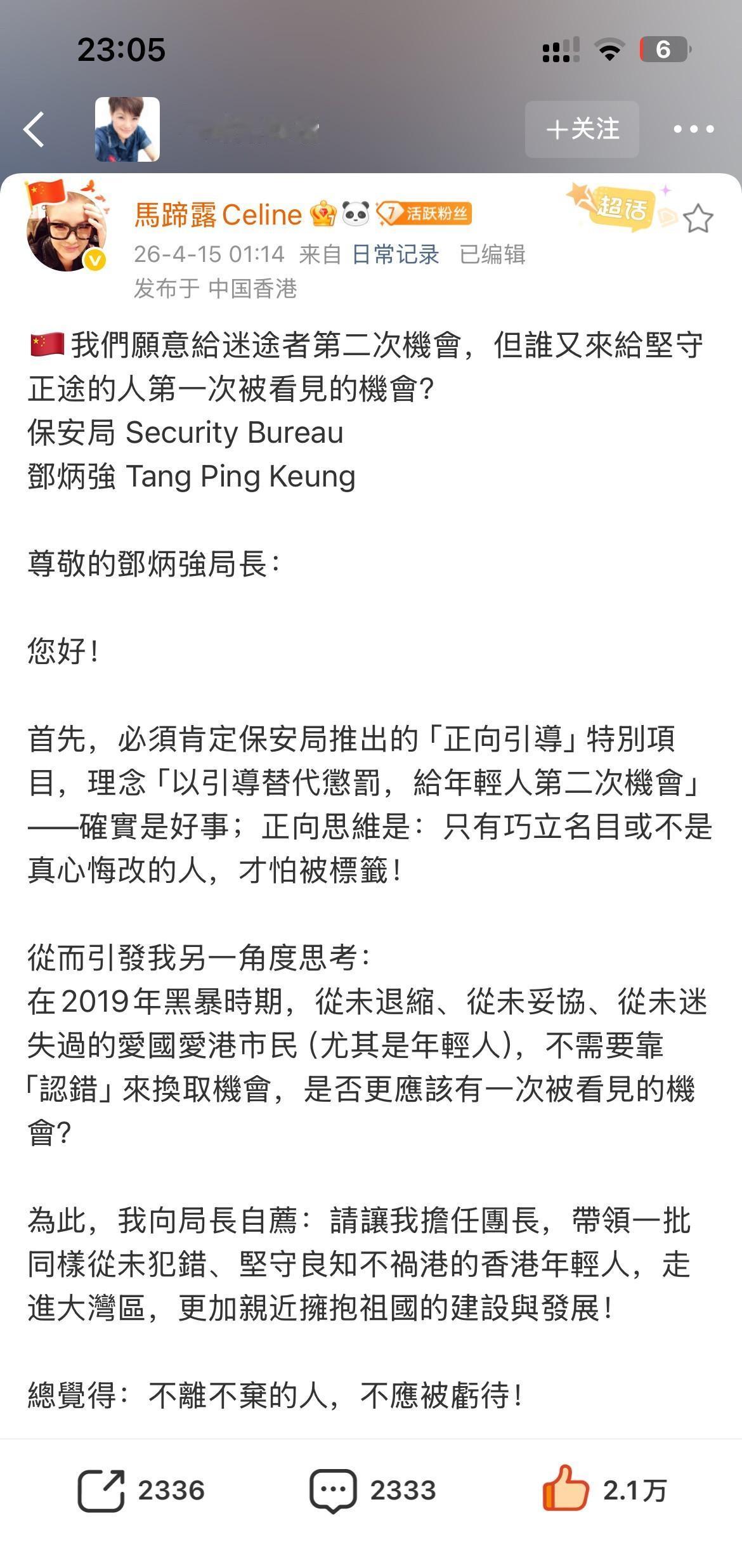 马蹄露没提他名字,但写了2019年黑暴时她去警署送横幅、被砸伤缝11针、后来还去广东社区帮老人剪头发。
