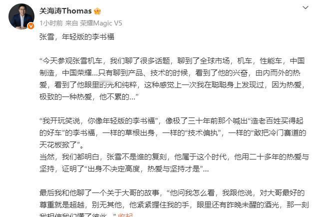 4月17日,荣耀全球首席营销官关海涛发文表示,张雪是年轻版的李书福。“一样的草根出身,一样的“技术偏执”,一样的“敢把冷门赛道的天花板掀了”。