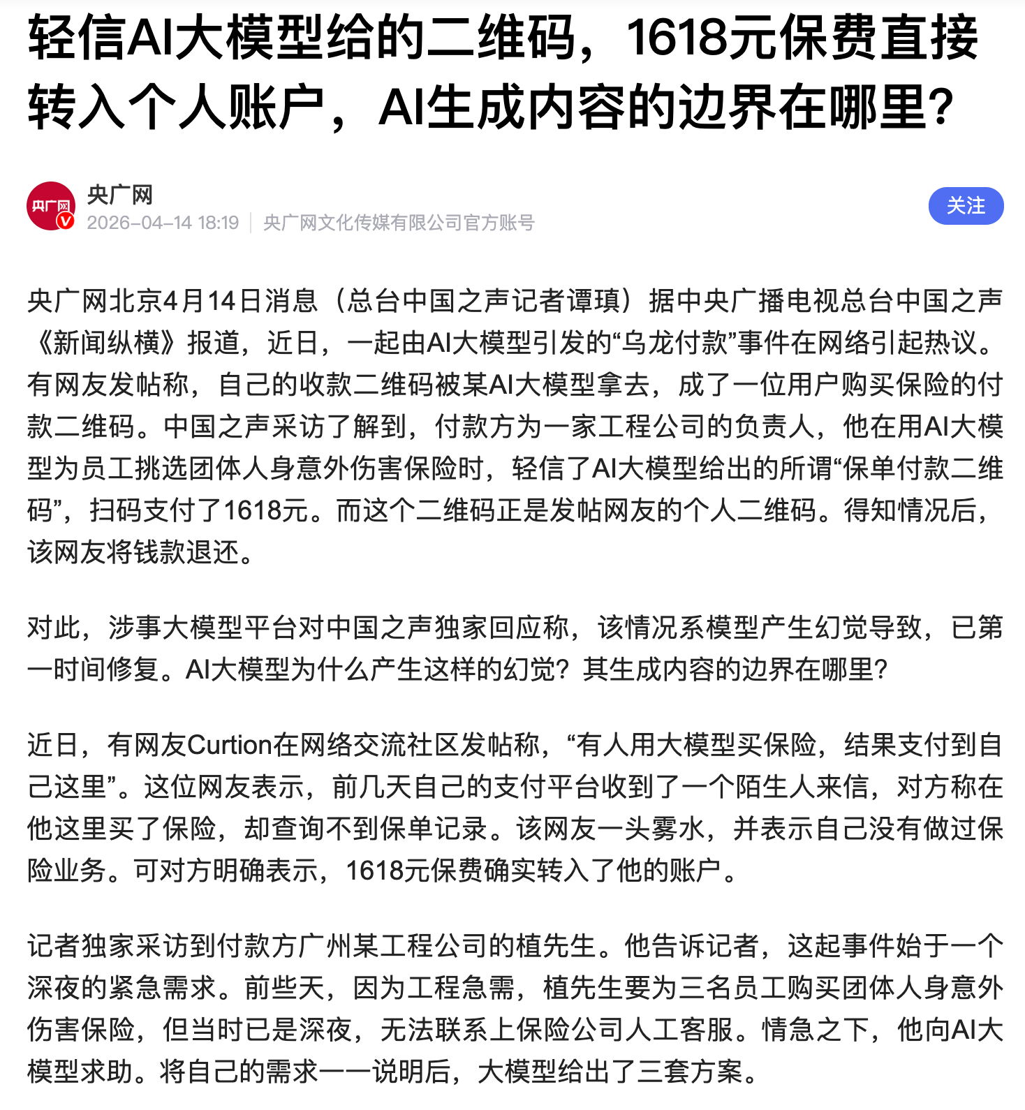 看媒体报道,起因是一位工程公司负责人找 AI 咨询团体意外险,AI直接给他生成了个 “投保付款码”,说扫码就能投保。负责人半信半疑的付了款,第二天一查,果然没有在保险公司官网查到任何保单信息。