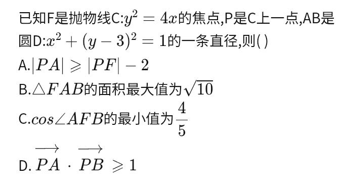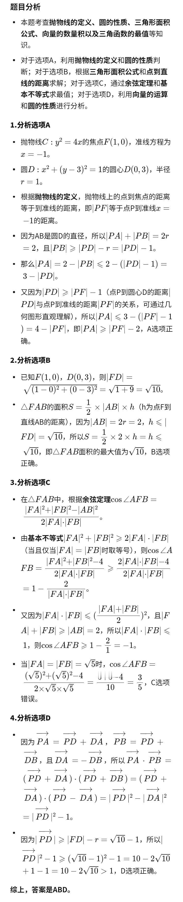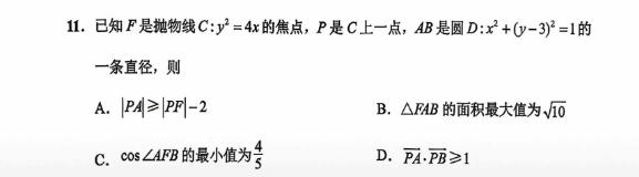 第11题抛物线的定义,余弦定理,基本不等式,向量等知识。
