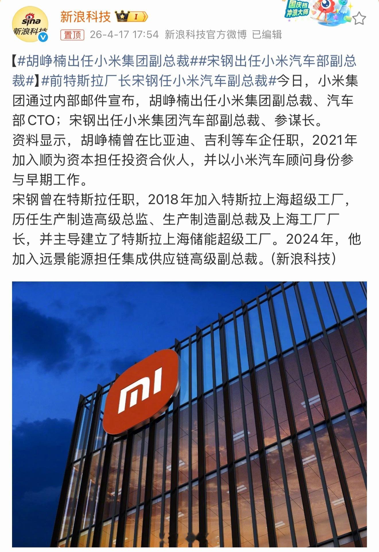 胡峥楠出任小米集团副总裁小米这步棋走得真稳。胡峥楠、宋钢一到位,加上之前的侯景雷、李田原们,最强造车天团算凑齐了。胡峥楠是跨体系打磨过爆款的全能型技术大佬,宋钢是见过福特、特斯拉世界级体系怎么运转的人。单独设CTO管技术架构,参谋长管组织协同,这摆明了是要从"能造爆款"往"能持续规模化"升级。造一款车靠运气,成为世界级车企靠体系,小米正在补这块能力。