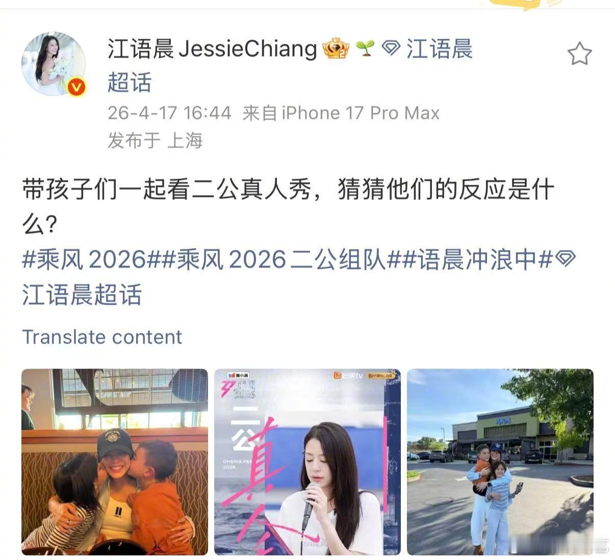 江语晨带孩子们看浪姐 太幸福啦!带着自己的两个宝贝一起看浪姐,孩子们也会为台上闪闪发光的妈妈骄傲吧!乘风2026