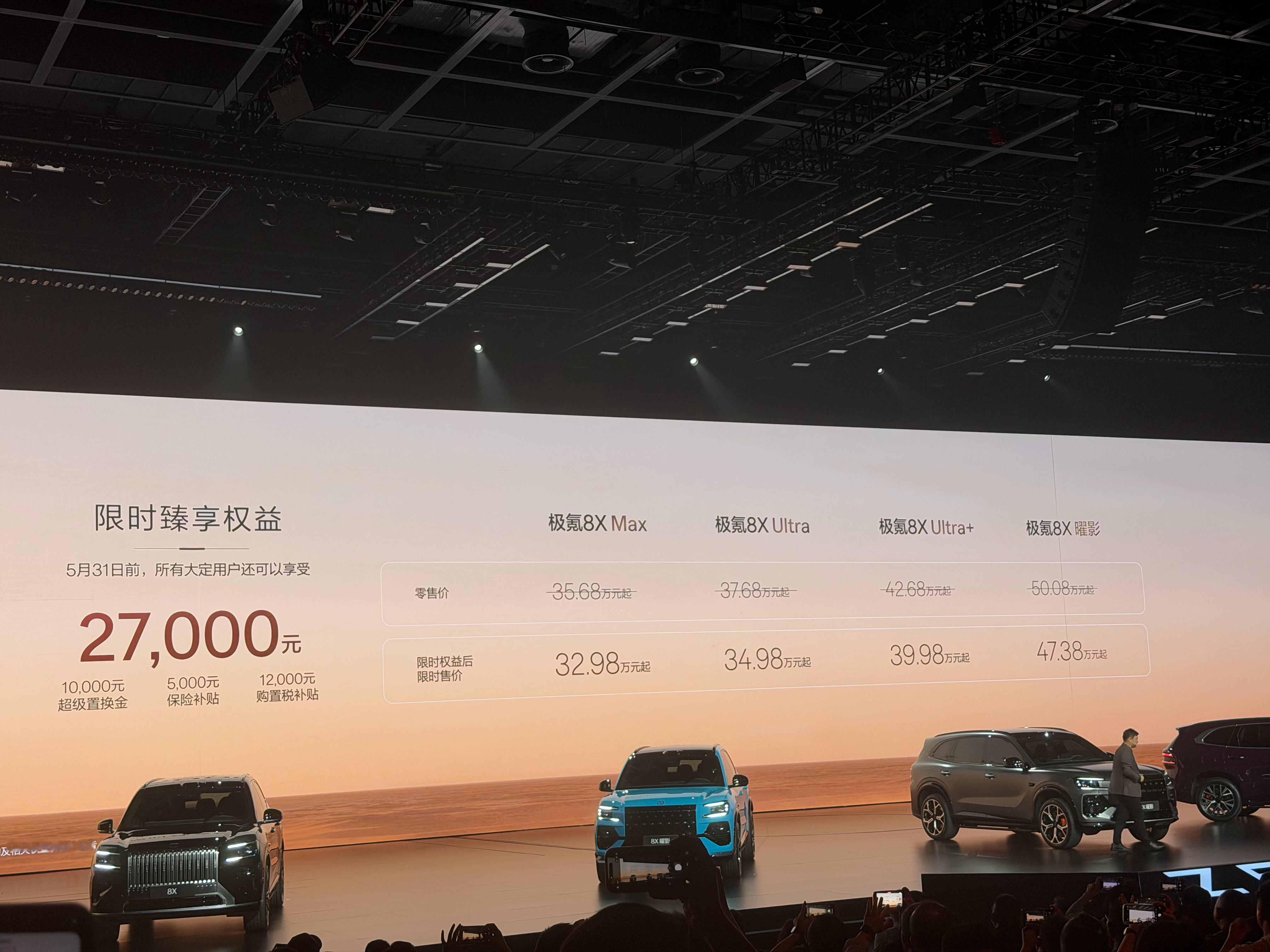 直接说重点!极氪8X正式上市价格叠加各种权益后,相比预售价格便宜了近五万!起售价直接来到了32.98万元起。当然,如果你跟我一样是首代极氪001车主,有千里浩瀚增换购权益劵就还能减免两万,这样起售价就来到了30.98万,这个价格只能说太香了