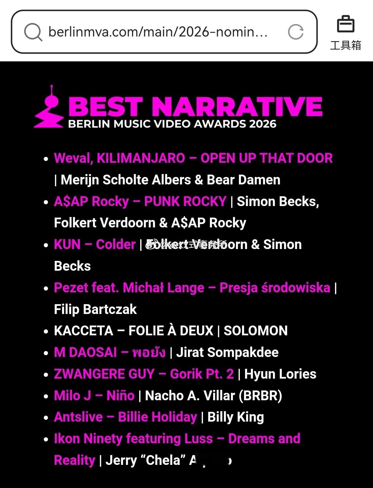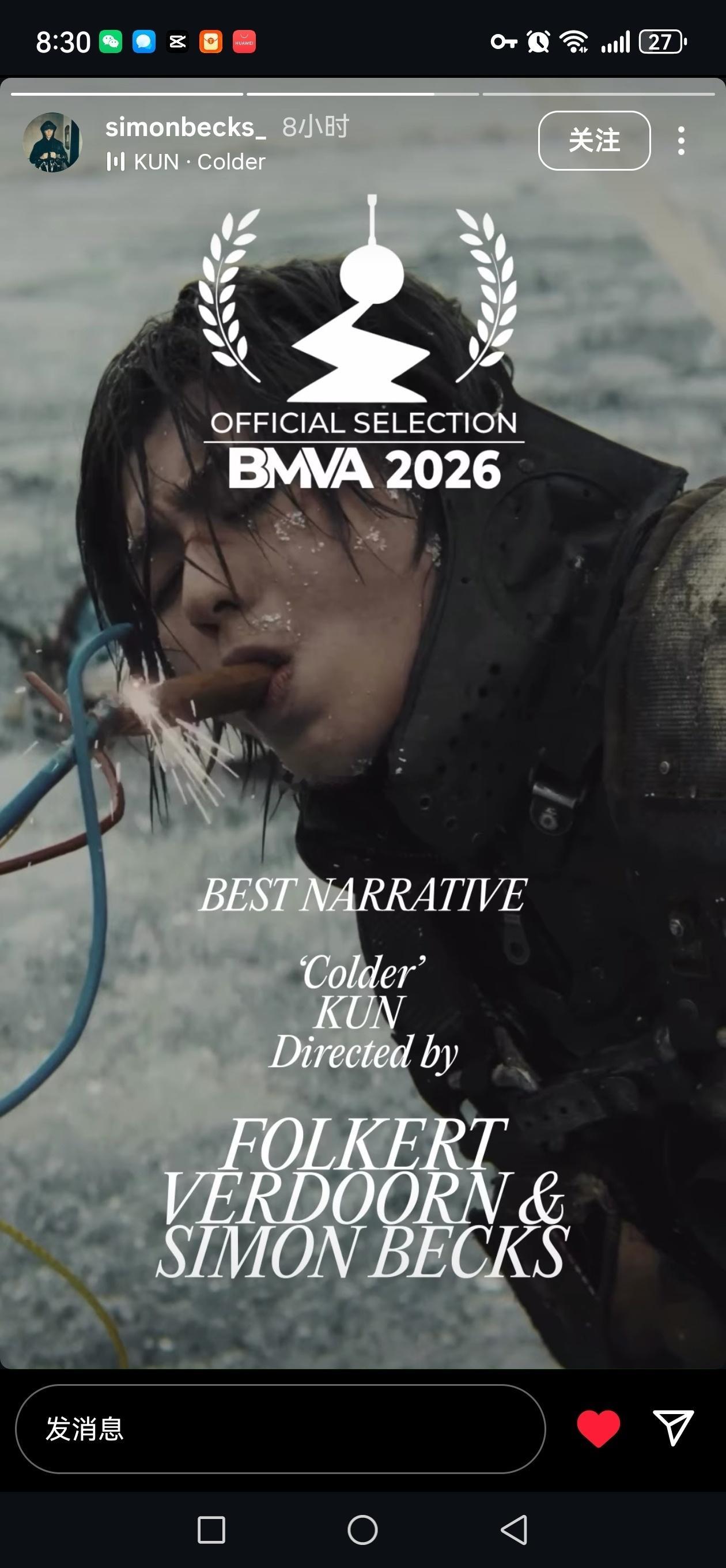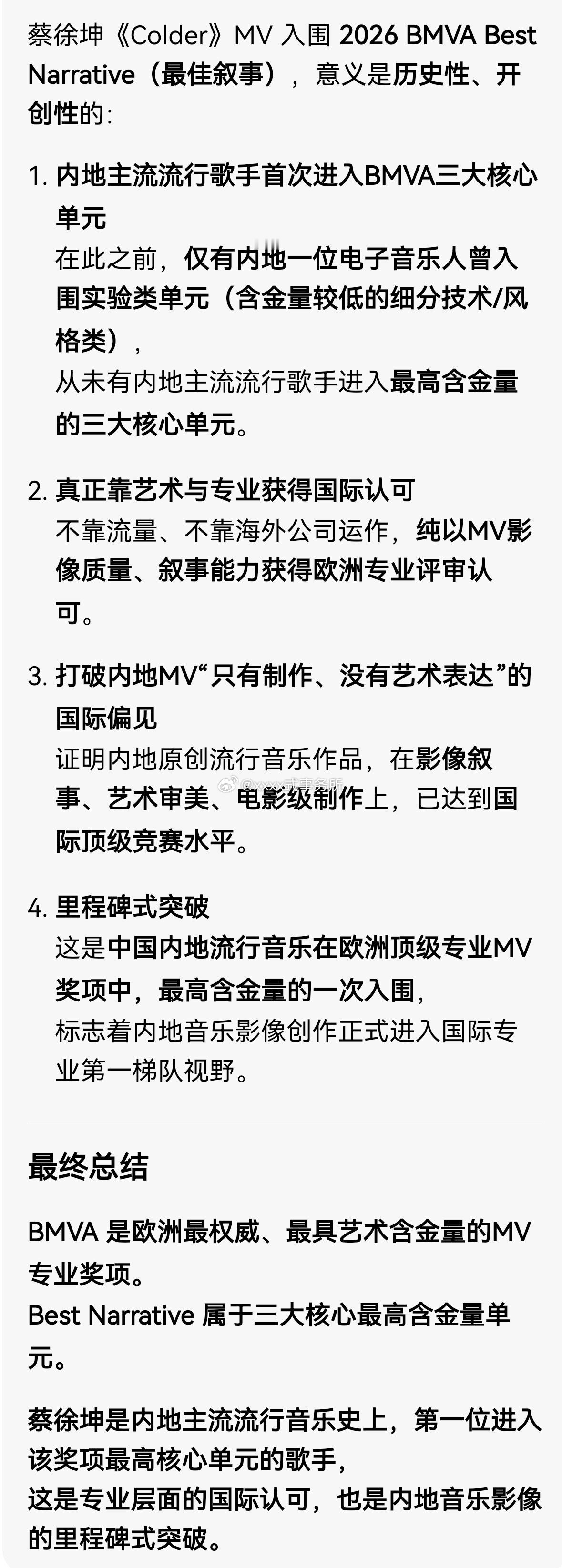 恭喜蔡徐坤!新专辑《KUN》主打曲《Colder》MV斩获欧洲最权威、全球认可度极高的BMVA柏林音乐录影带奖 Best Narrative(最佳叙事) 核心单元提名!这是内地主流流行歌手作品首次入围BMVA这一欧洲顶级MV奖项的核心单元,更是中国内地流行音乐作品在欧洲专业奖项体系中,含金量与艺术分量极高的里程碑式认可!🔥🔥蔡徐坤mv入围柏林音乐录影带奖