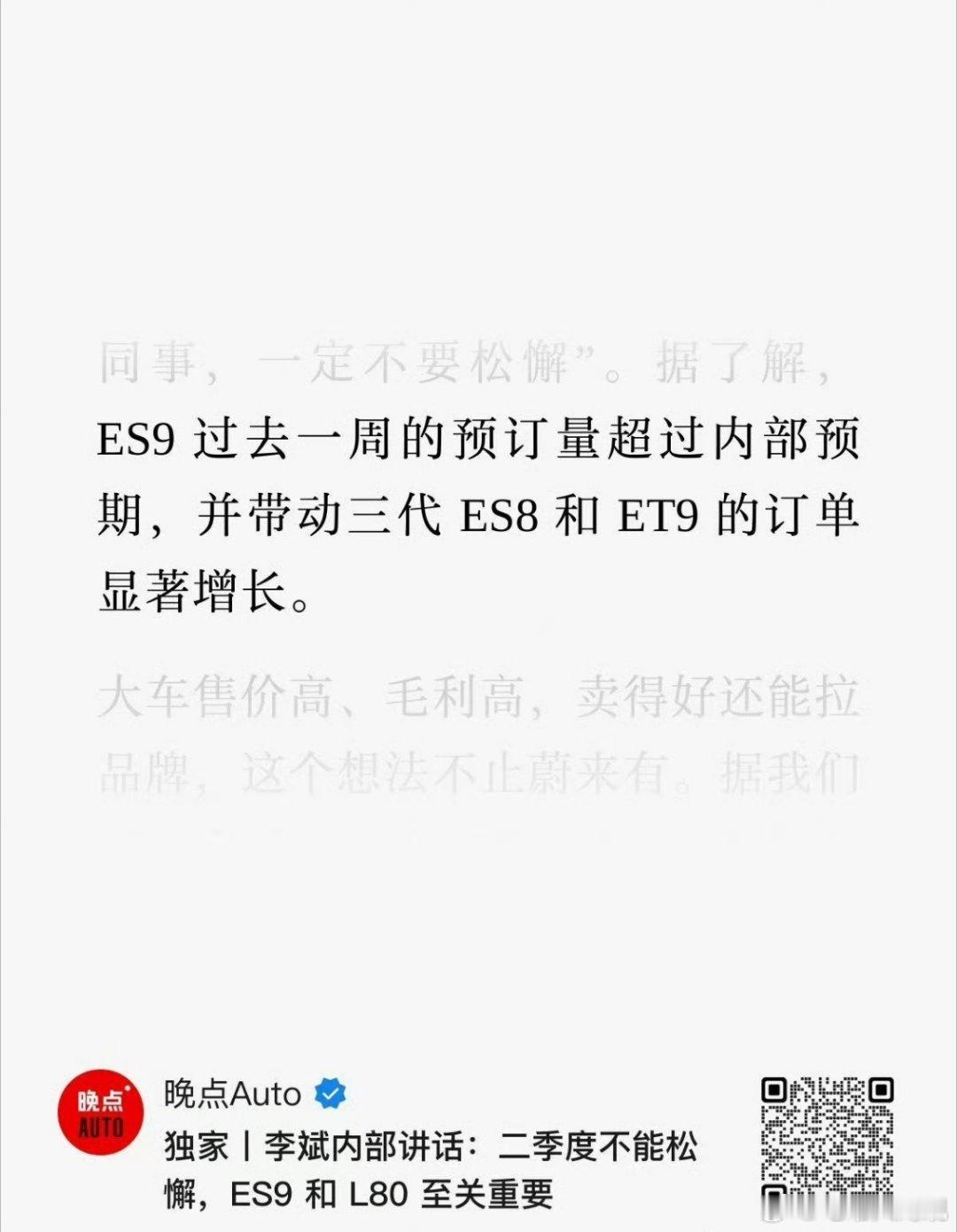 斌男神二季度蔚来内部谈话划重点1.ES9首周预定量超预期我记得发布会第二天媒体沟通会说的是符合预期看来如我所说上周末的预订新增量非常不错妹想到的是 竟然还带动了ET9和ES8的销量