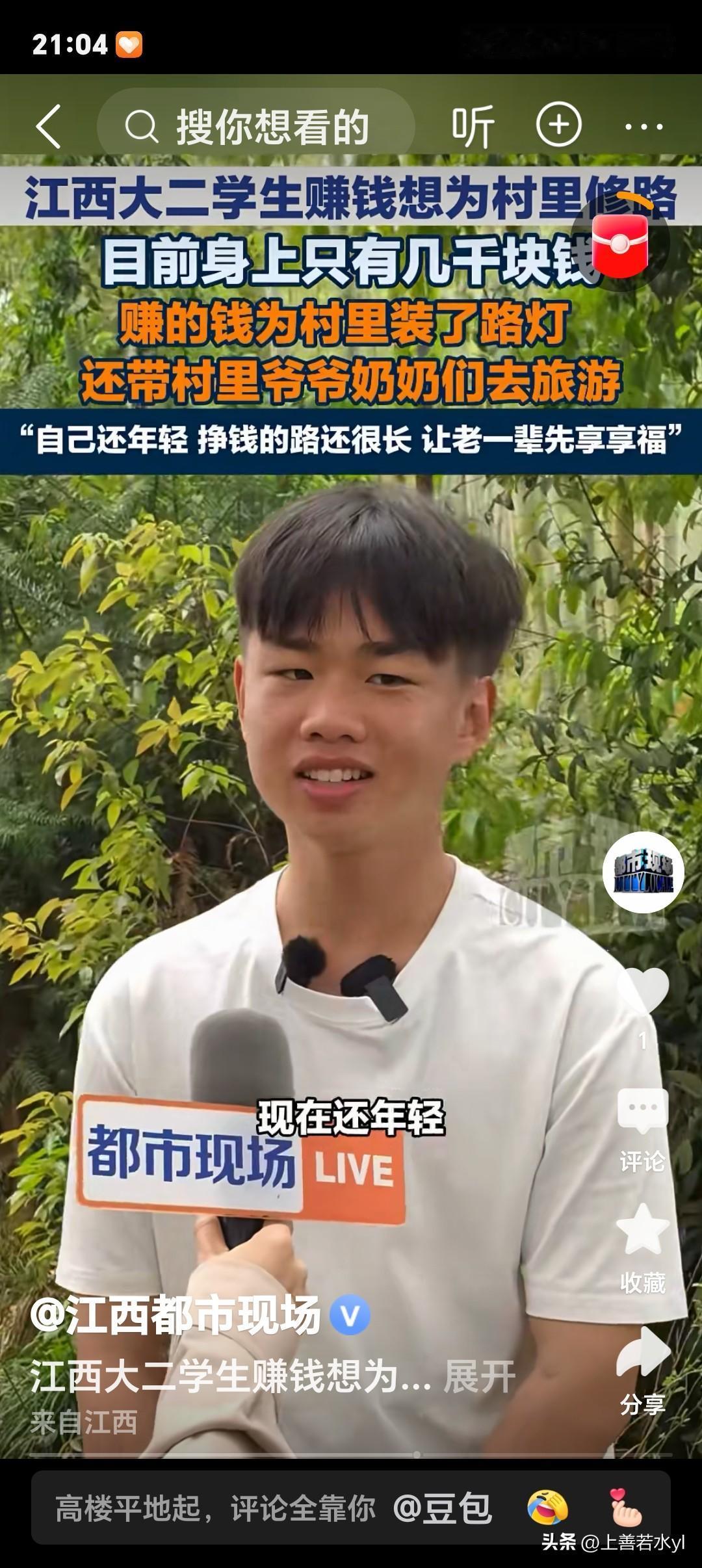 他把寒暑假挣的钱都花给了村里,等挣钱多了还准备给村里修路。他说自己还年轻,以后挣钱的路还长,让老一辈先享享福。多好多孝顺的孩子,为小伙子点赞!