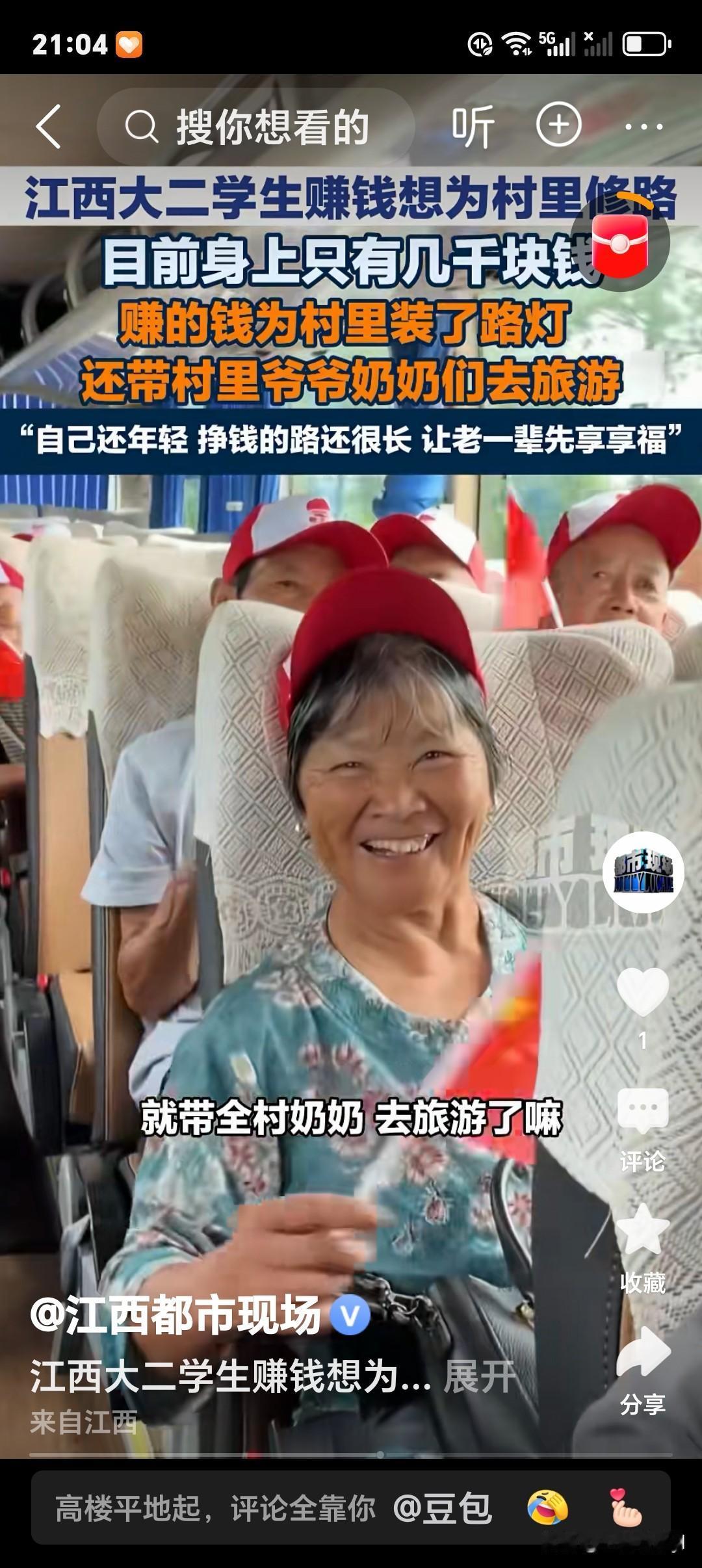 暑假又去摆摊挣点钱,他想着村里的很多爷爷奶奶年纪很大了,也没出过远门,他就出钱带着全村的爷爷奶奶们去旅游。