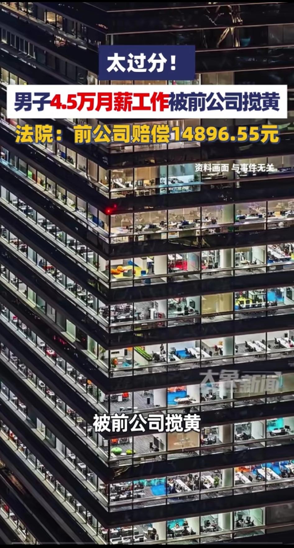 太过分!男子4.5万月薪工作被前公司搅黄,法院:前公司赔偿14896元。