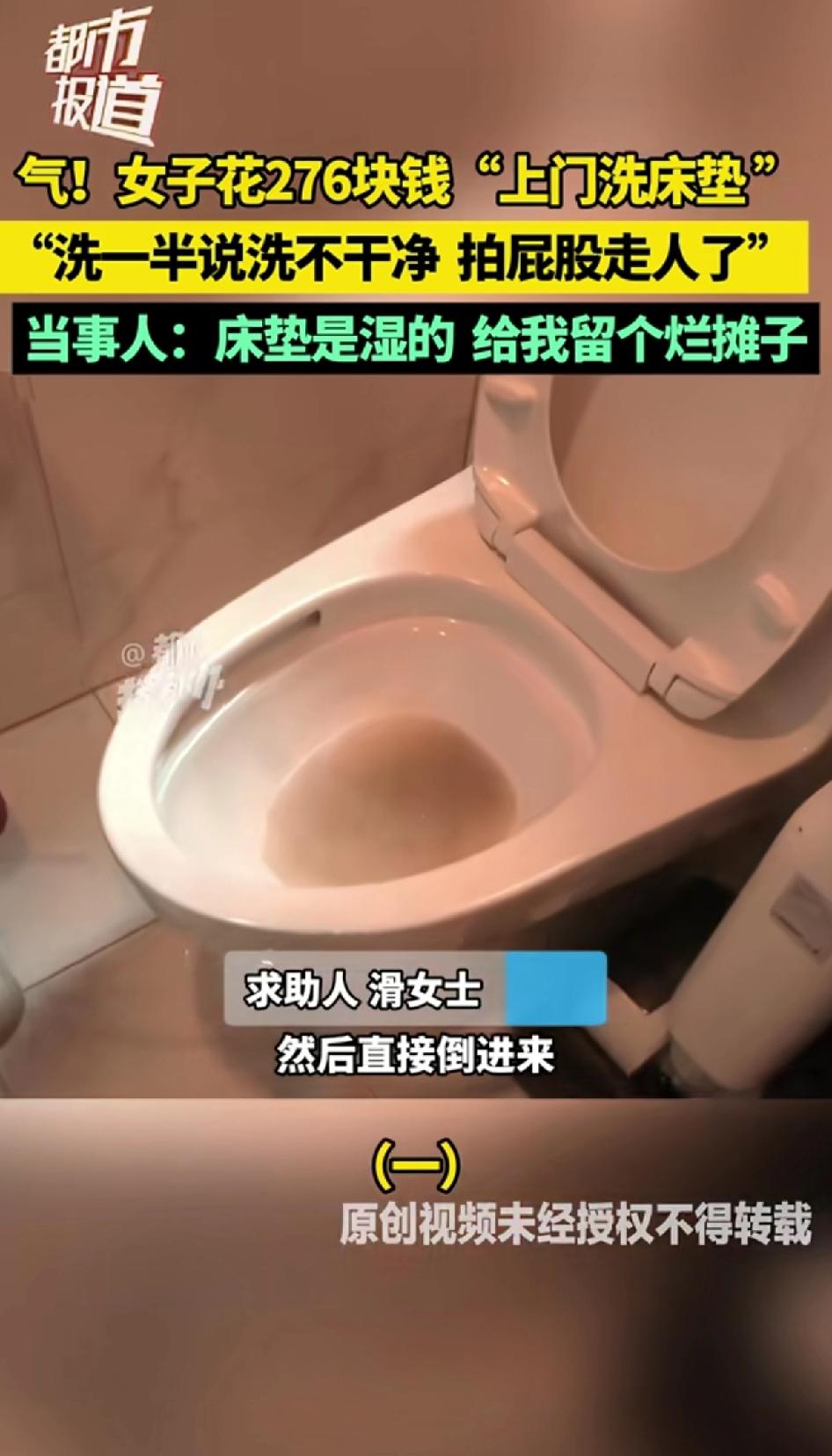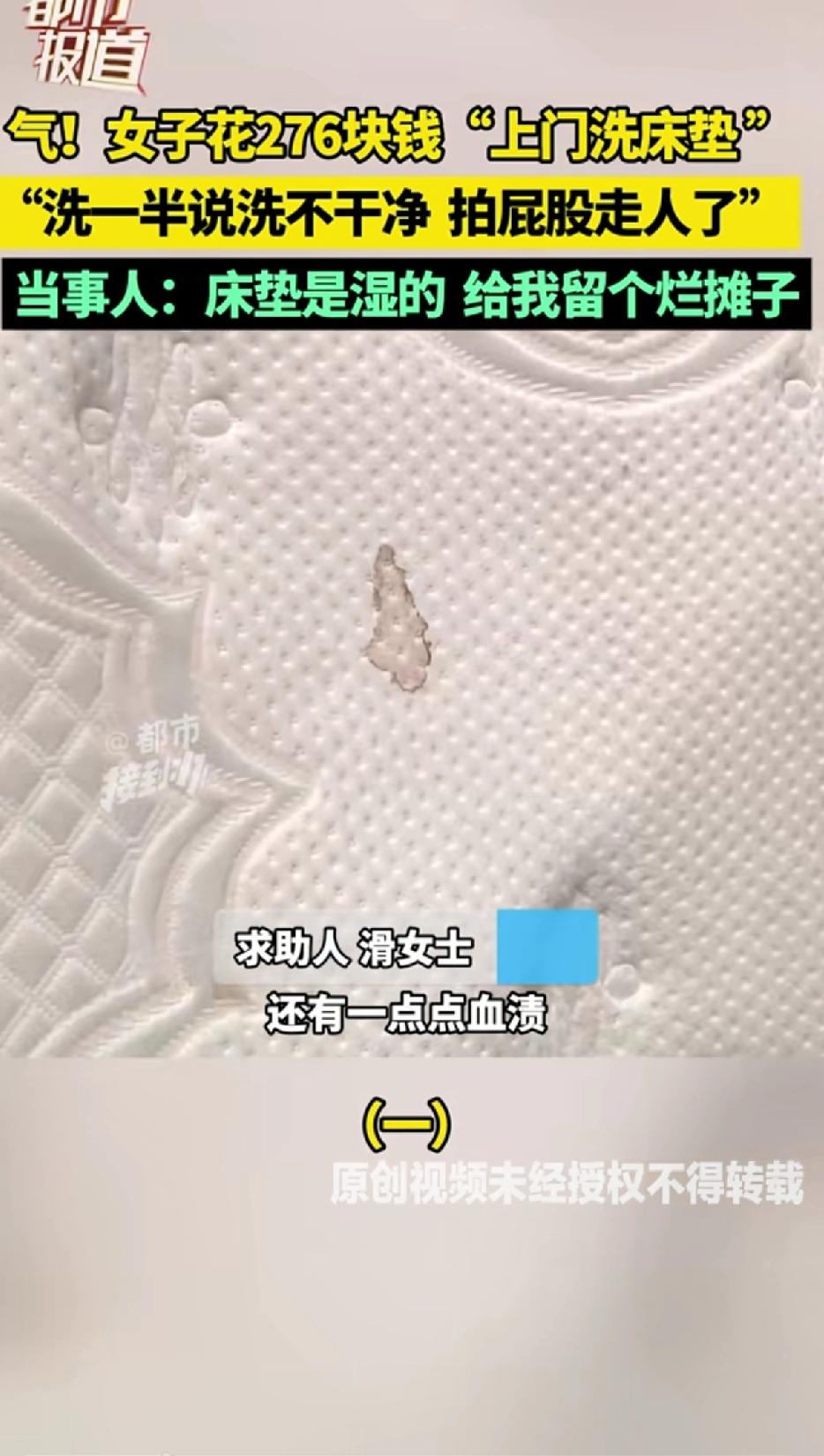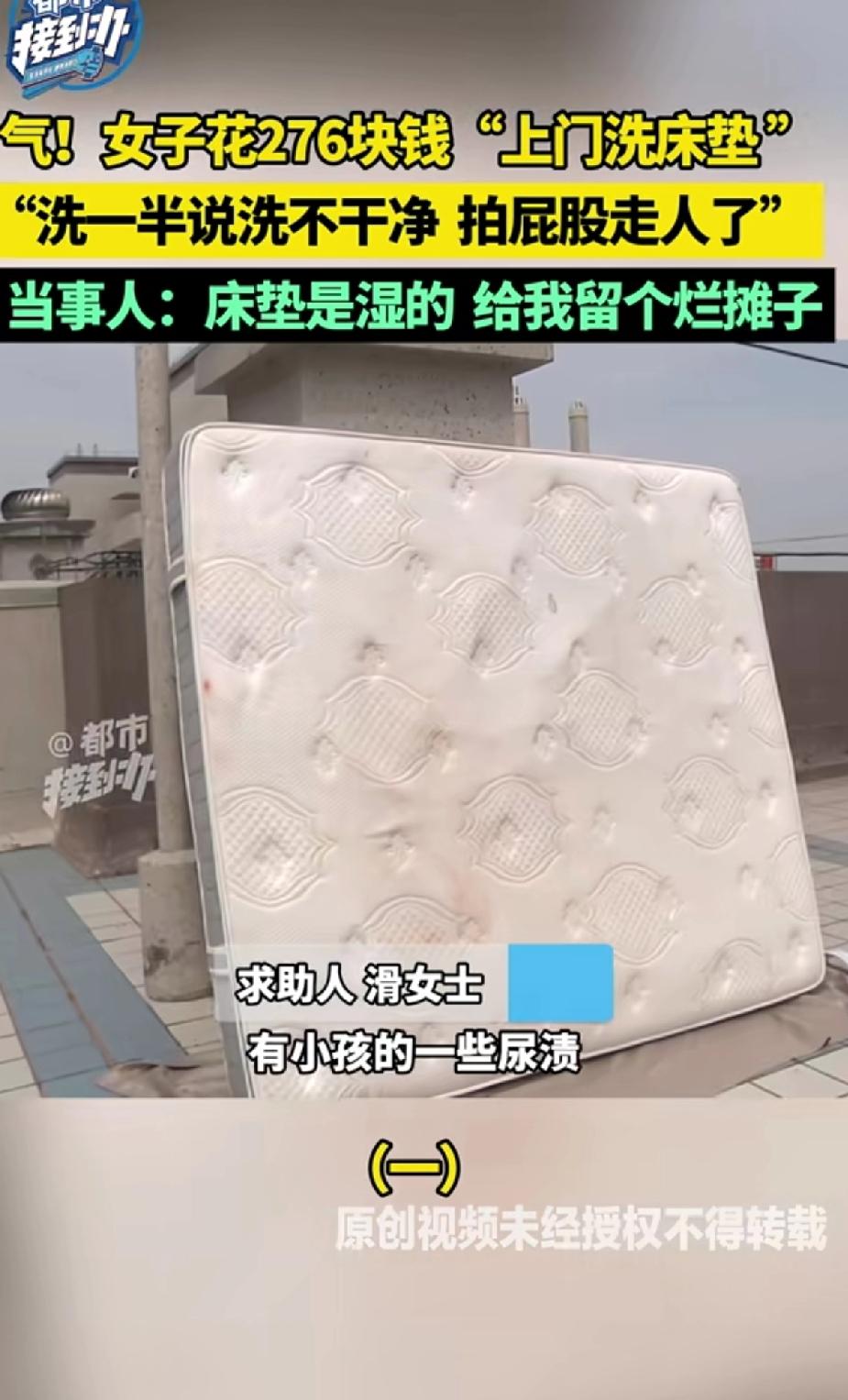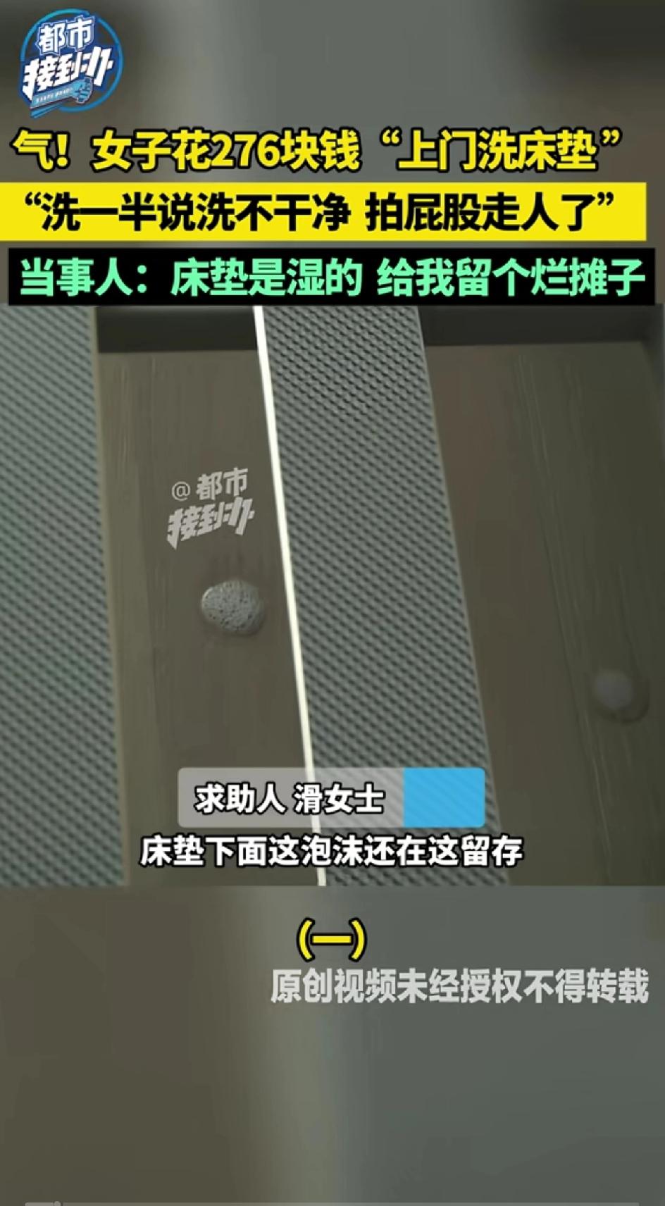 气人!女子花276块钱找“上门洗床垫”不料洗一半说洗不干净,拍屁股走人了”,床底下的泡沫和地上的水都没清理人就走了,当事人:床垫是湿的,给我留个烂摊子。