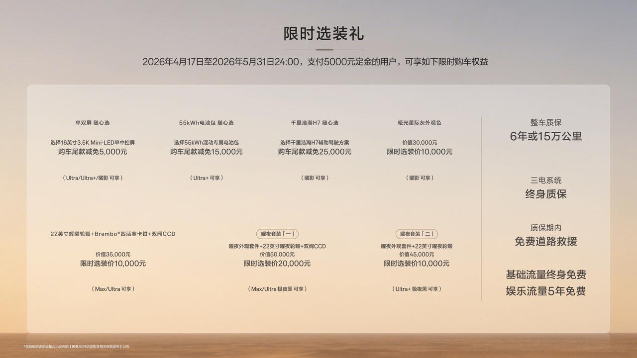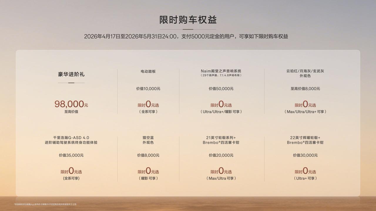 安全底盘拉满:首创双门环+双金箍棒车身,电池985防护;4S级AI数字底盘,标配双腔空悬+CCD减振,80km/h过侧倾<2°。智能拉满:首发EVA语音助手,高配5激光雷达+双Thor芯片,1400TOPS算力,支持无图城市NOA。