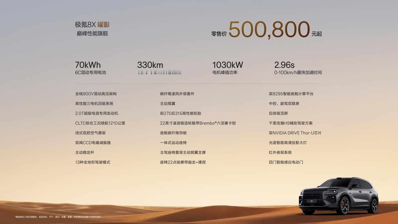 核心亮点拉满:曜影版搭混动首个三电机兆瓦电驱,1030kW综合功率,2.96秒零百;双电机版660kW,3.7秒破百。全栈900V高压架构+6C超快充,20%-80%仅9分钟,10分钟补能280km。70度电池CLTC纯电410km,综合续航1416km,兼顾性能与续航。