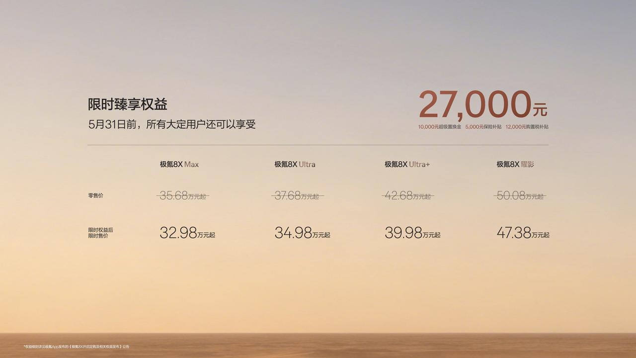 新公路之王极氪8X正式上市,上市权益价32.98万元起,极氪品牌新车首任车主增换购,连续5年赠送1,000度/每年免费充电额度等等。