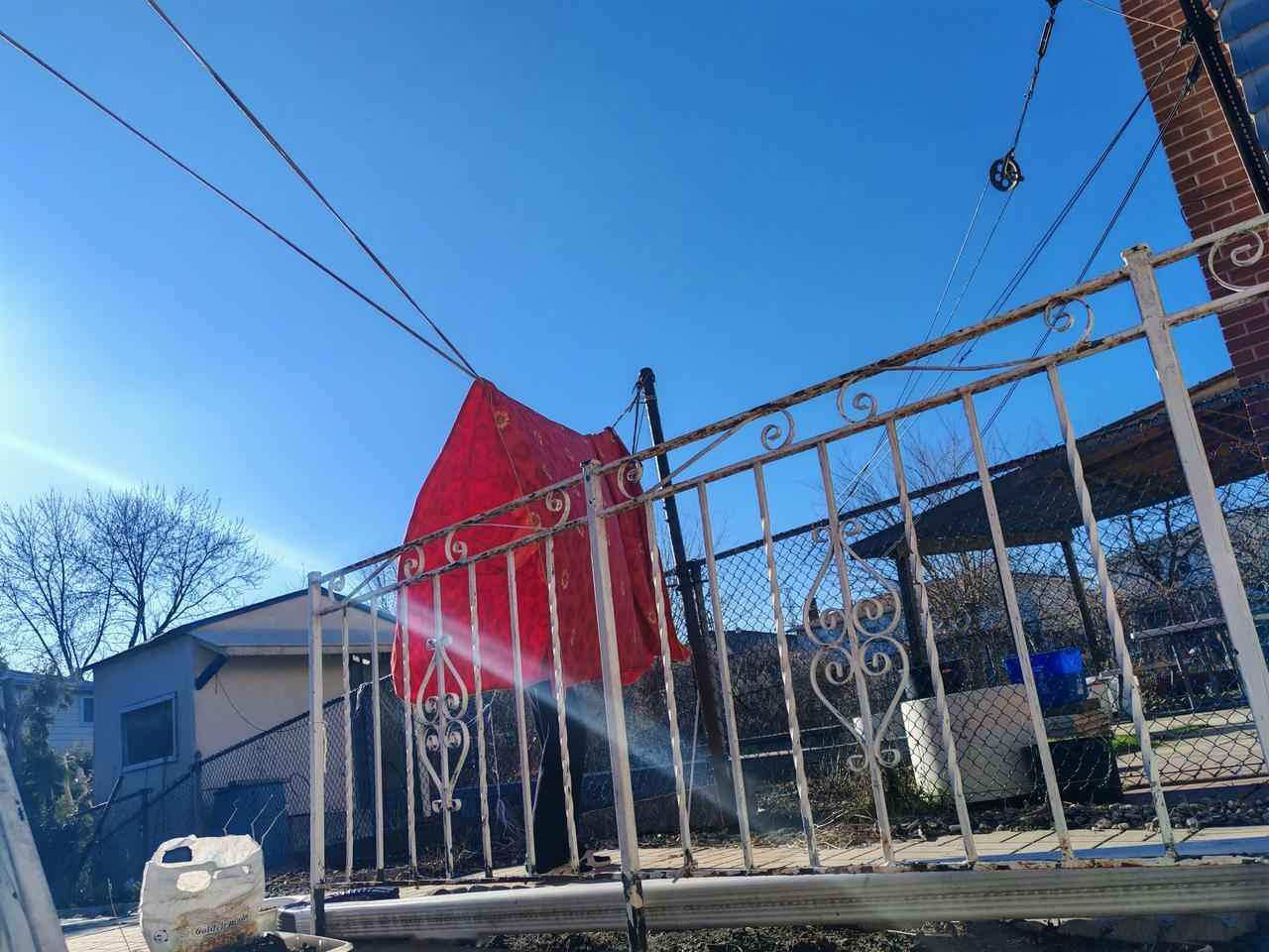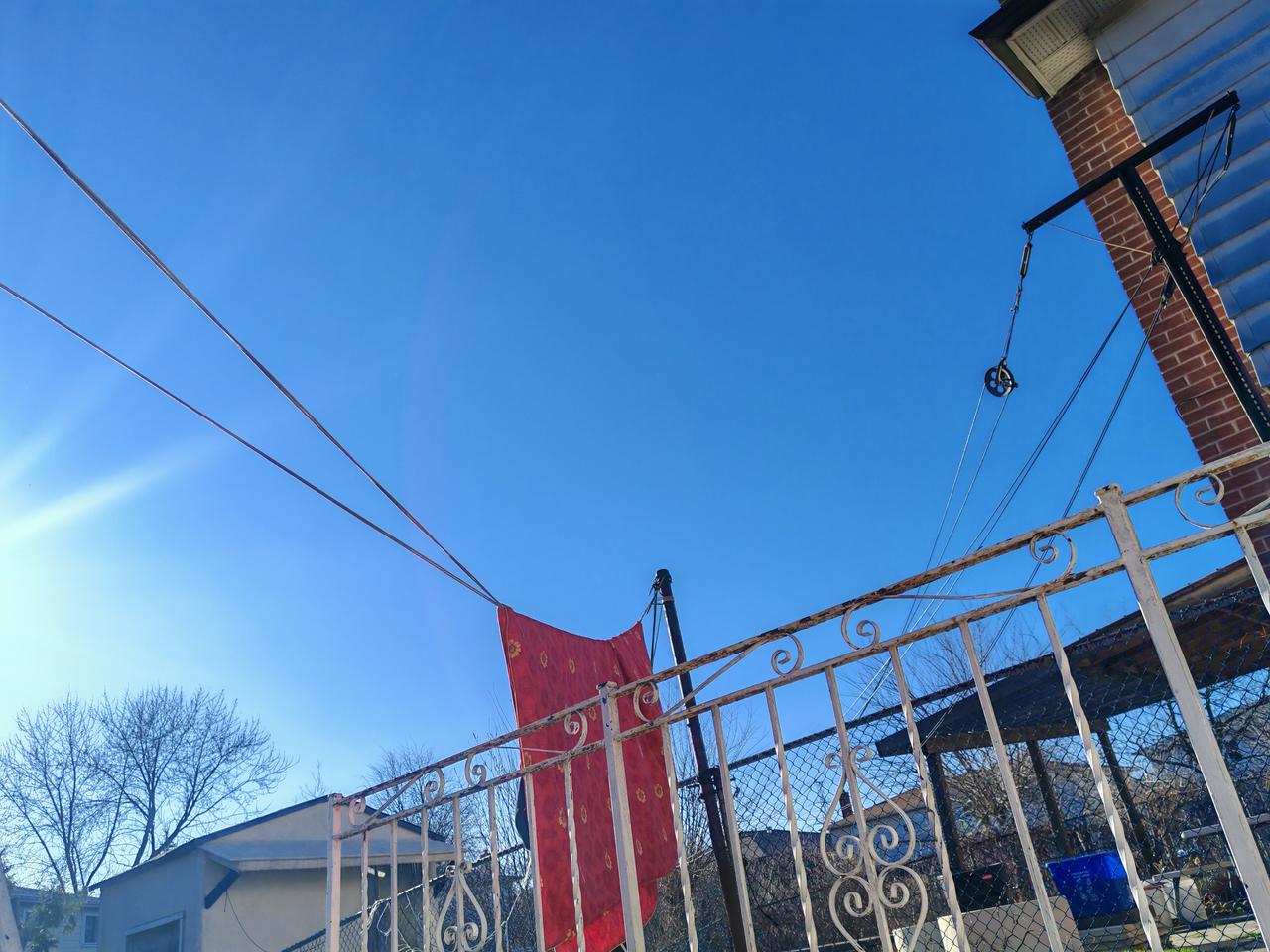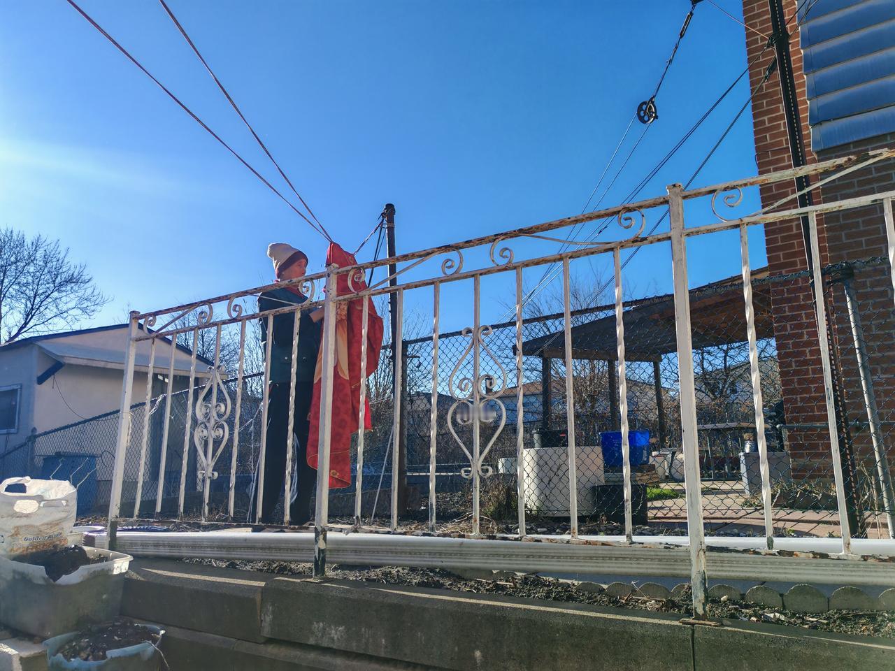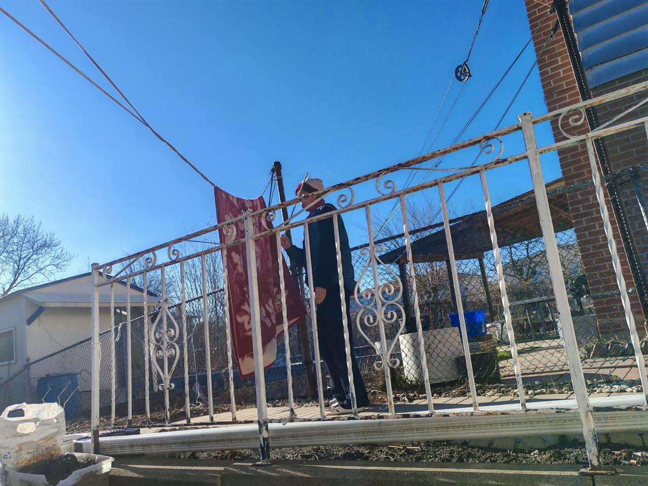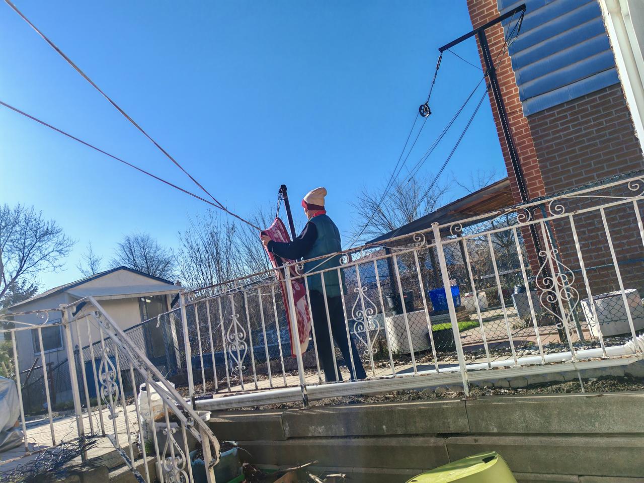 太阳出来了,又把我们铺在床上的毛毯也拿出去晒了,拿小棍敲了!