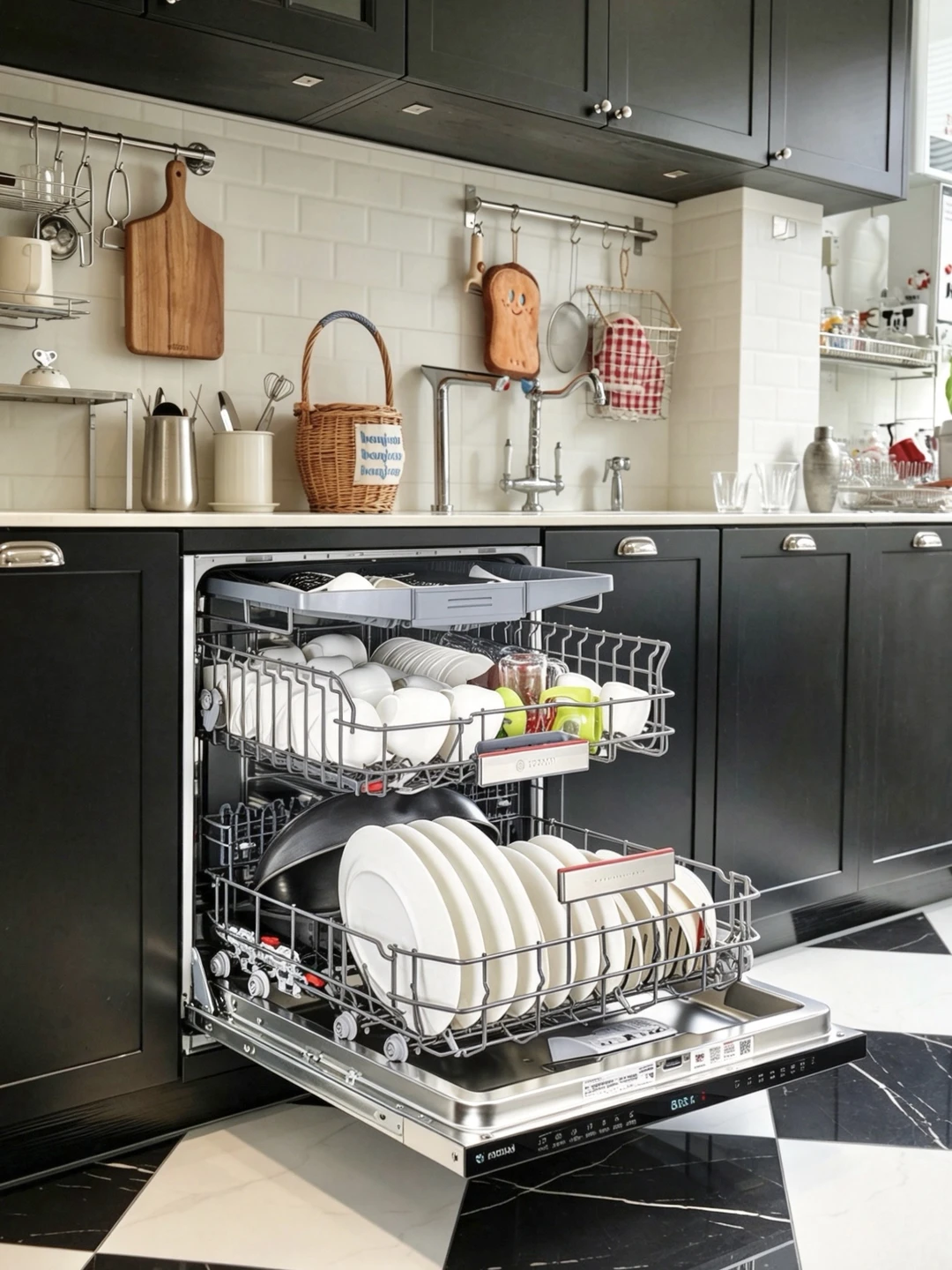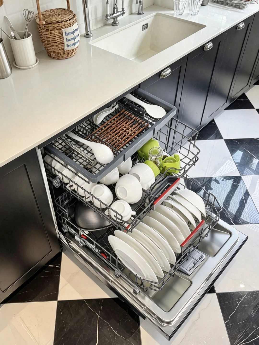 牛排锅的焦硬黑垢、干了三天的顽固咖啡渍、糊满火锅底料的碗底,统统塞进去,它能集中4倍水流,定点强力冲刷,开门瞬间,餐具锃光瓦亮,跟新的一样。洗完还能直接当碗柜用,能抑菌储存,随取随用,比普通碗篮更卫生干净。