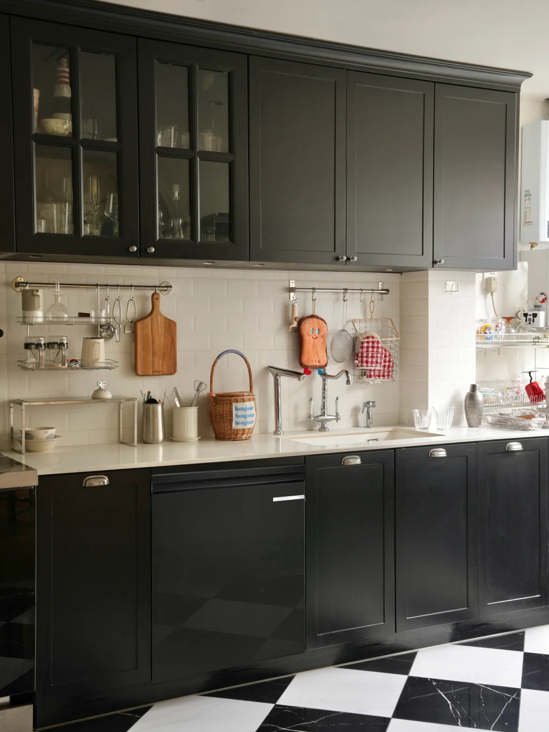 我家法式复古设计我很满意的就是厨房,黑白棋盘格瓷砖拼接而成,烤漆质感的黑色橱柜,复古摩登氛围十足。厨房台面呈一字型,活动范围大,便于移动,炒、切、洗功能分区明显。