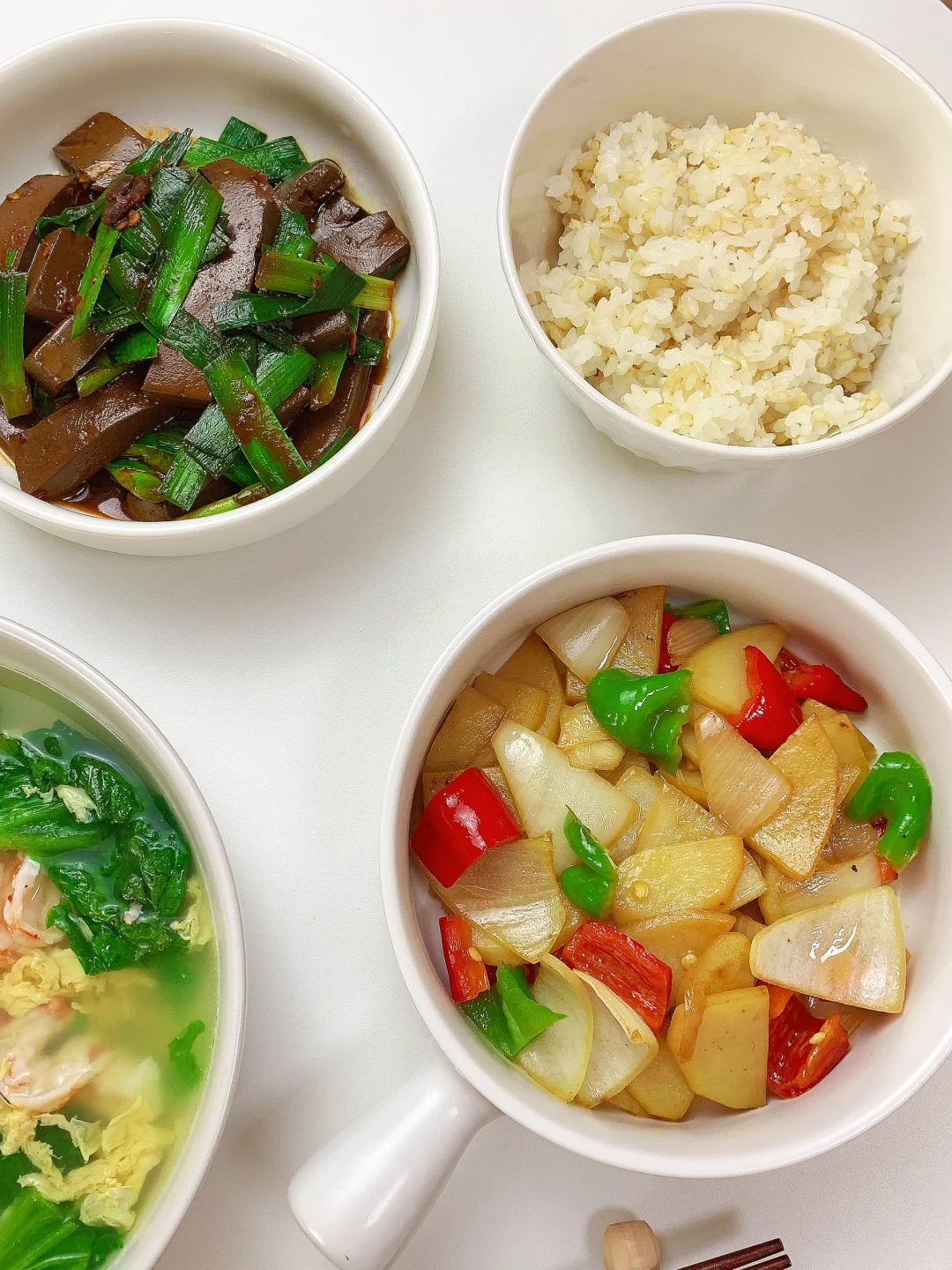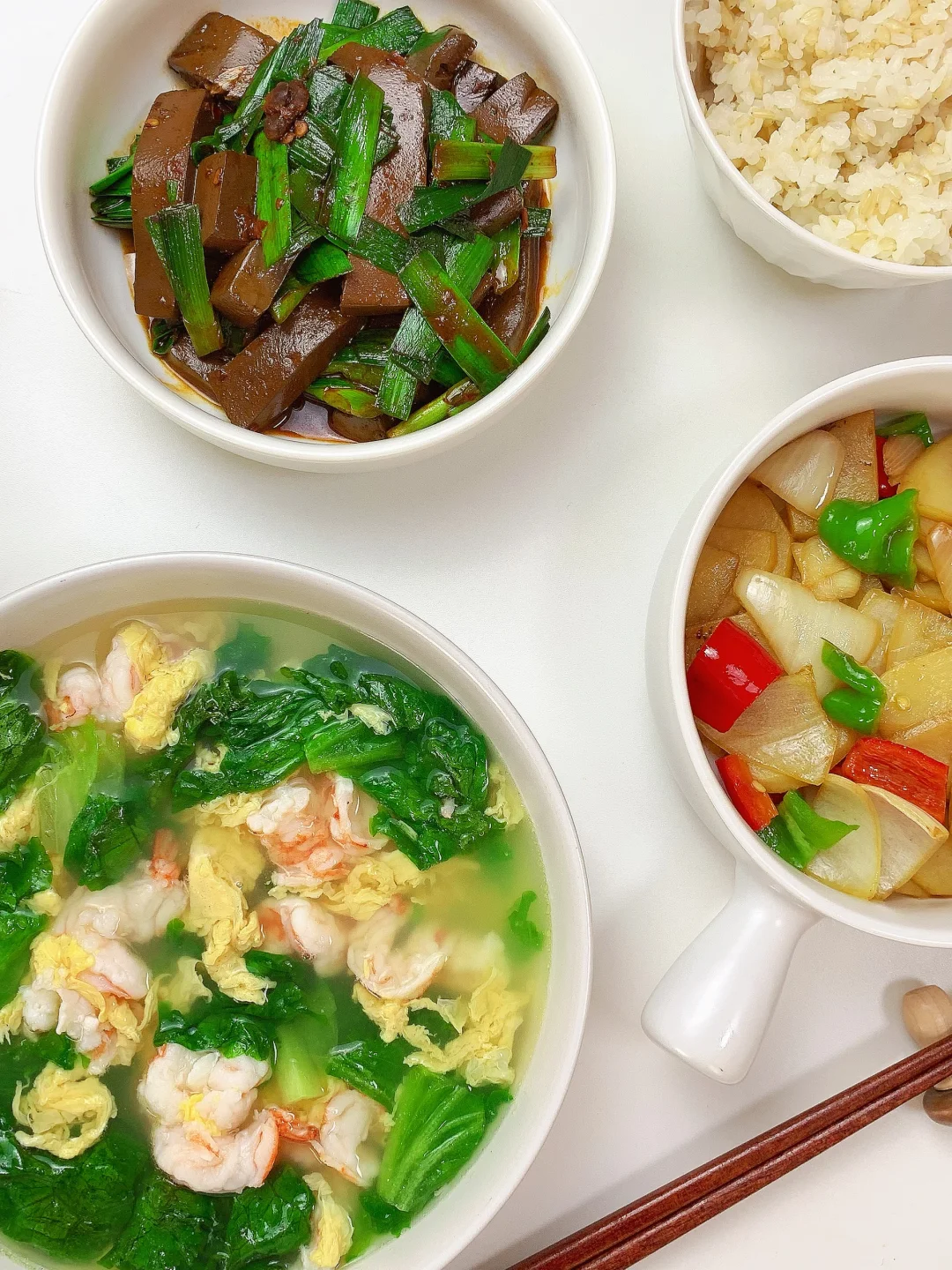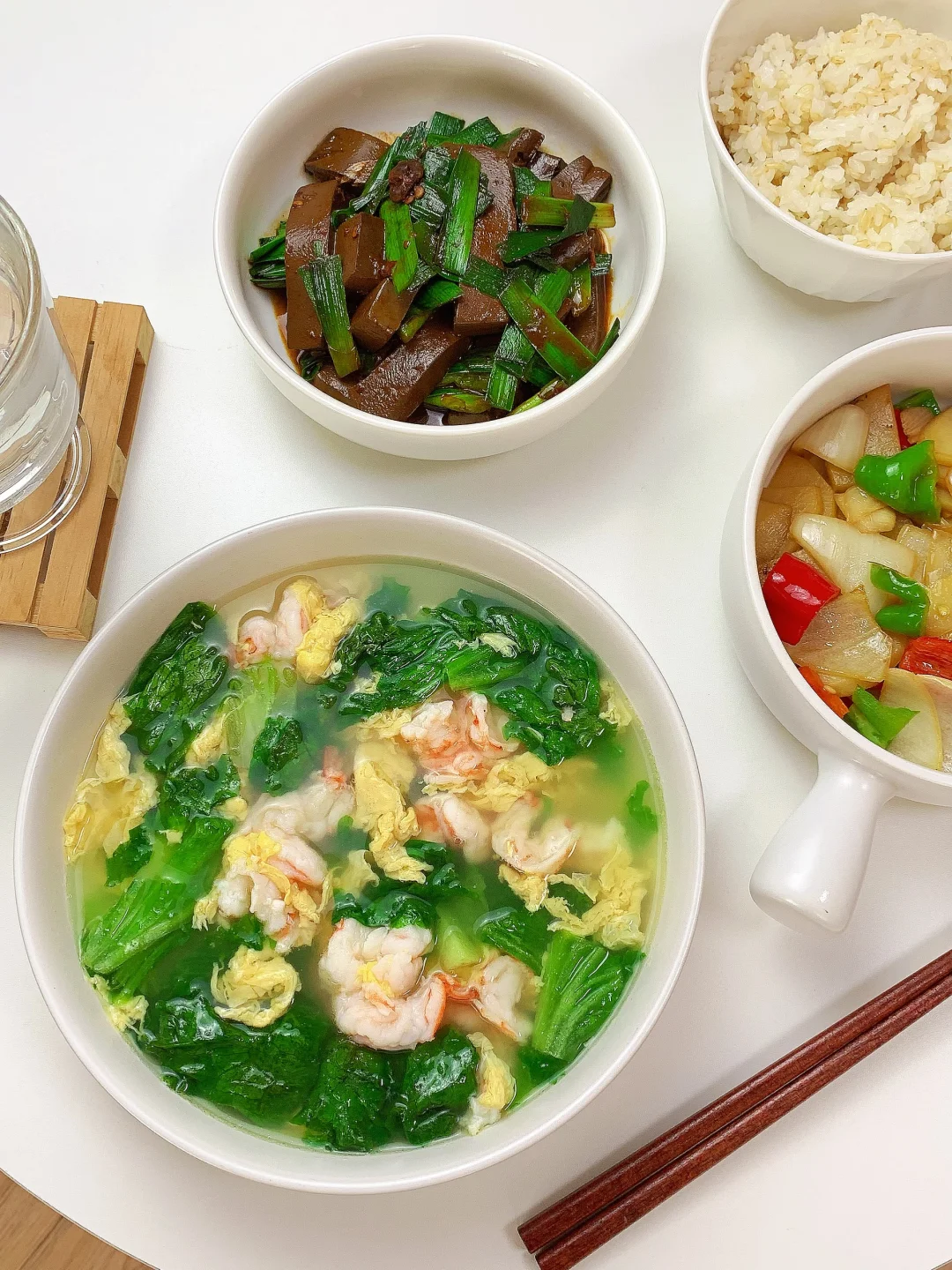 鲜蔬小炒+虾仁蛋汤,清淡低卡一人食