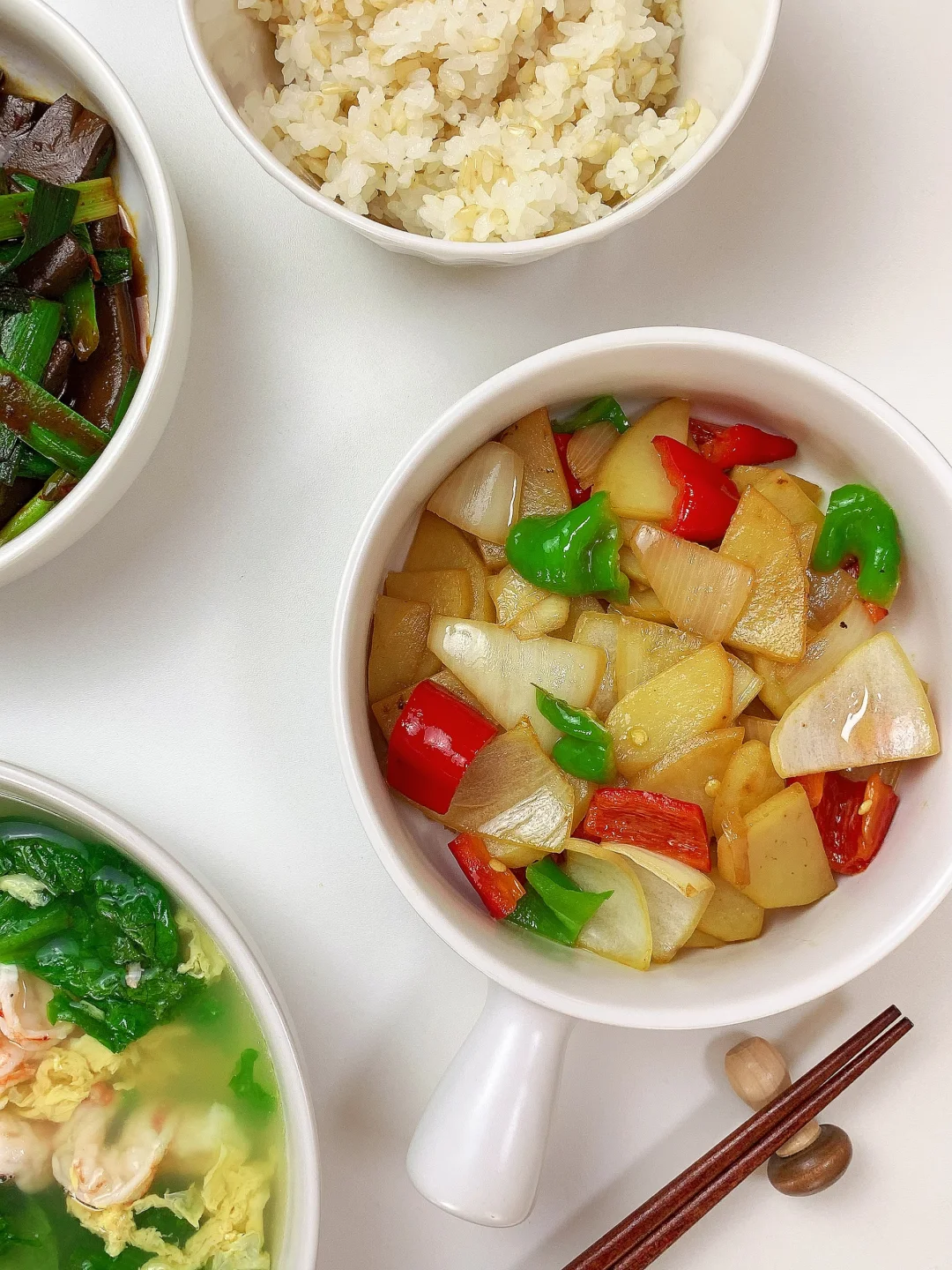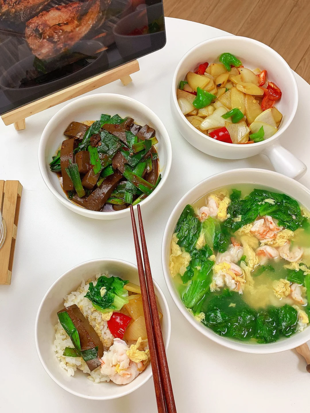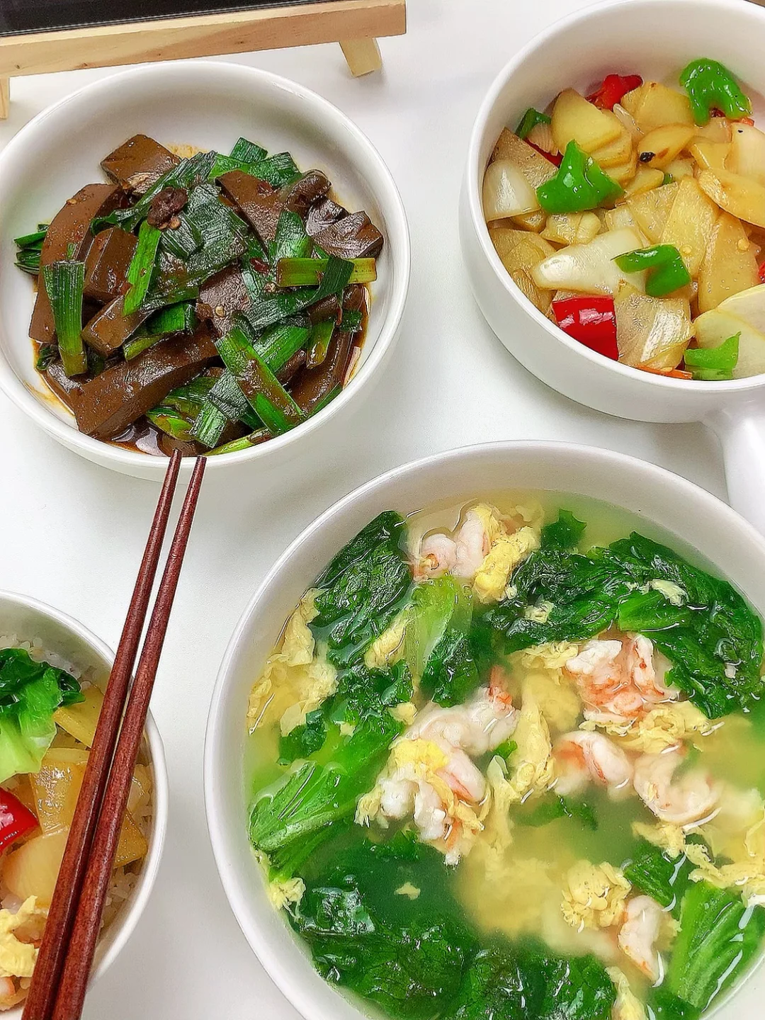 鲜蔬小炒+虾仁蛋汤,清淡低卡一人食
