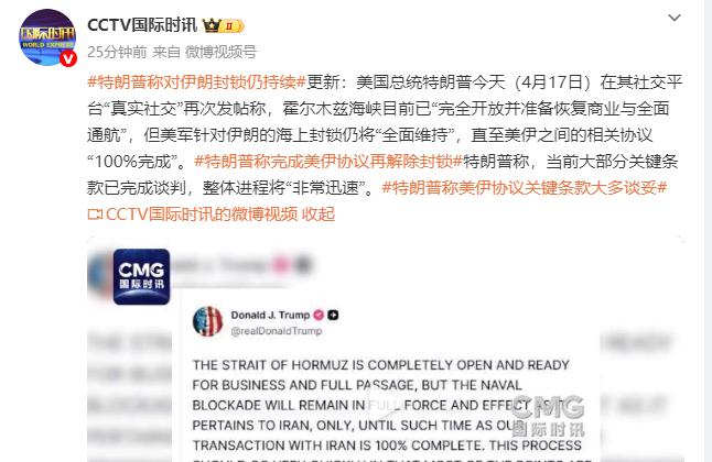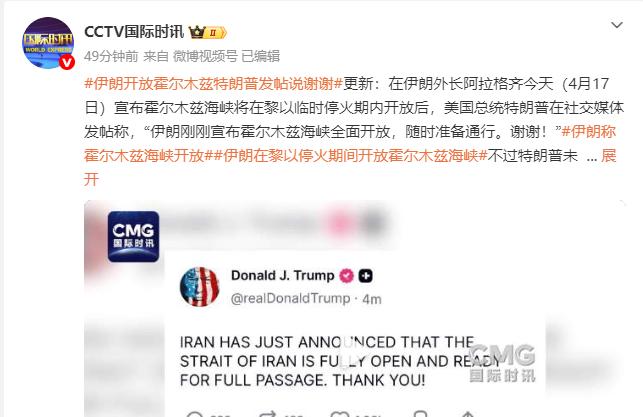 4月17日,特朗普发布了一个重要的消息,就是霍尔木兹海峡已完全开放了,可以正常通行,最后特朗普还称谢谢,估计就是谢谢伊朗的这个决定。