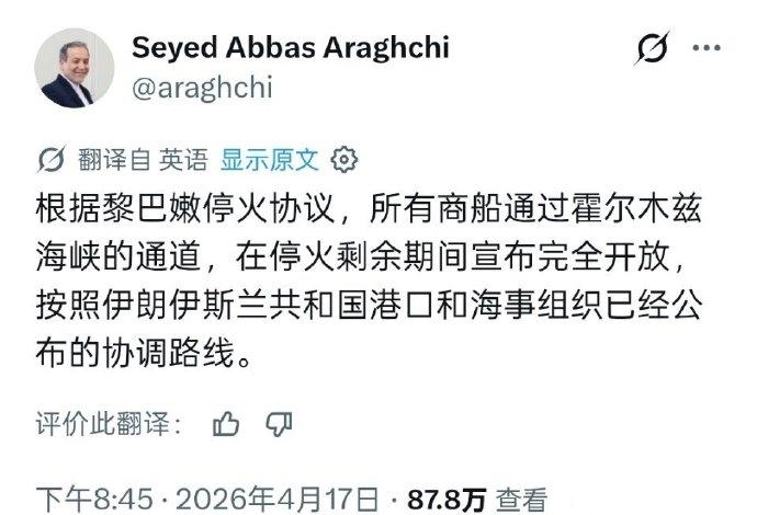 不过霍尔木兹海峡完全开放并不是一直开放,伊朗外长阿拉格齐表示,这个开放是有时间限制的,就是适用于停火剩余期间。还有不少网友发问道:也就是说要是以后继续停火的话,那么霍尔木兹海峡已完全开放了,这是伊朗“跪了”吗?