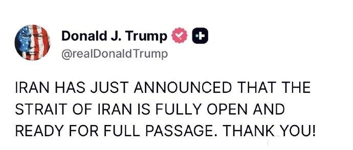 特朗普宣布霍尔木兹海峡已完全开放,还称该海峡是伊朗海峡!