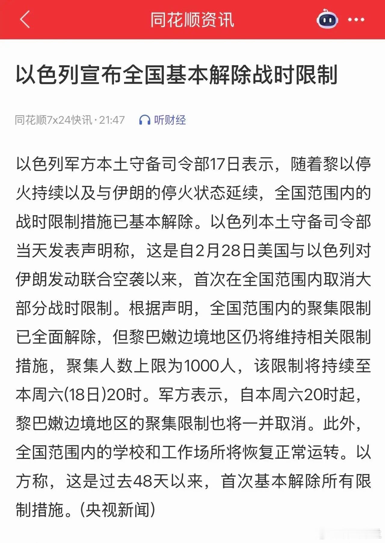 三是以色列宣布全国基本解除战时限制;