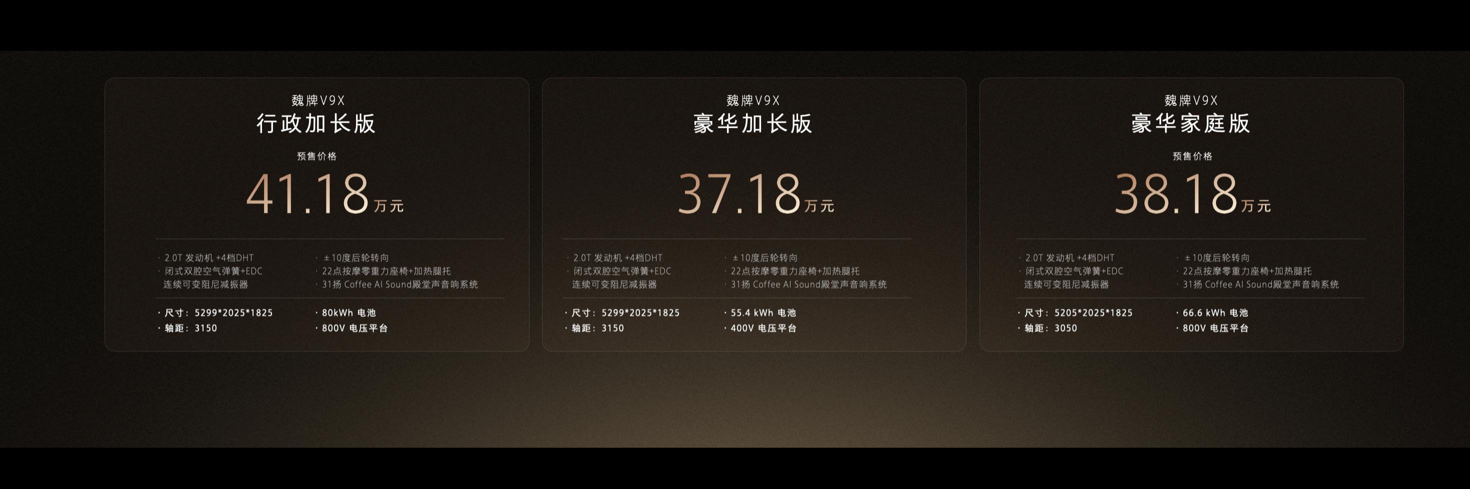 归元S平台,五种动力随便选,轴距能伸能缩,全球五星安全打底,这平台底子太厚了。V9X作为头牌,37.18万起售,加长版反而比家庭版便宜一万,这定价我看不懂但大受震撼,老魏是真不会算账还是太会算账?