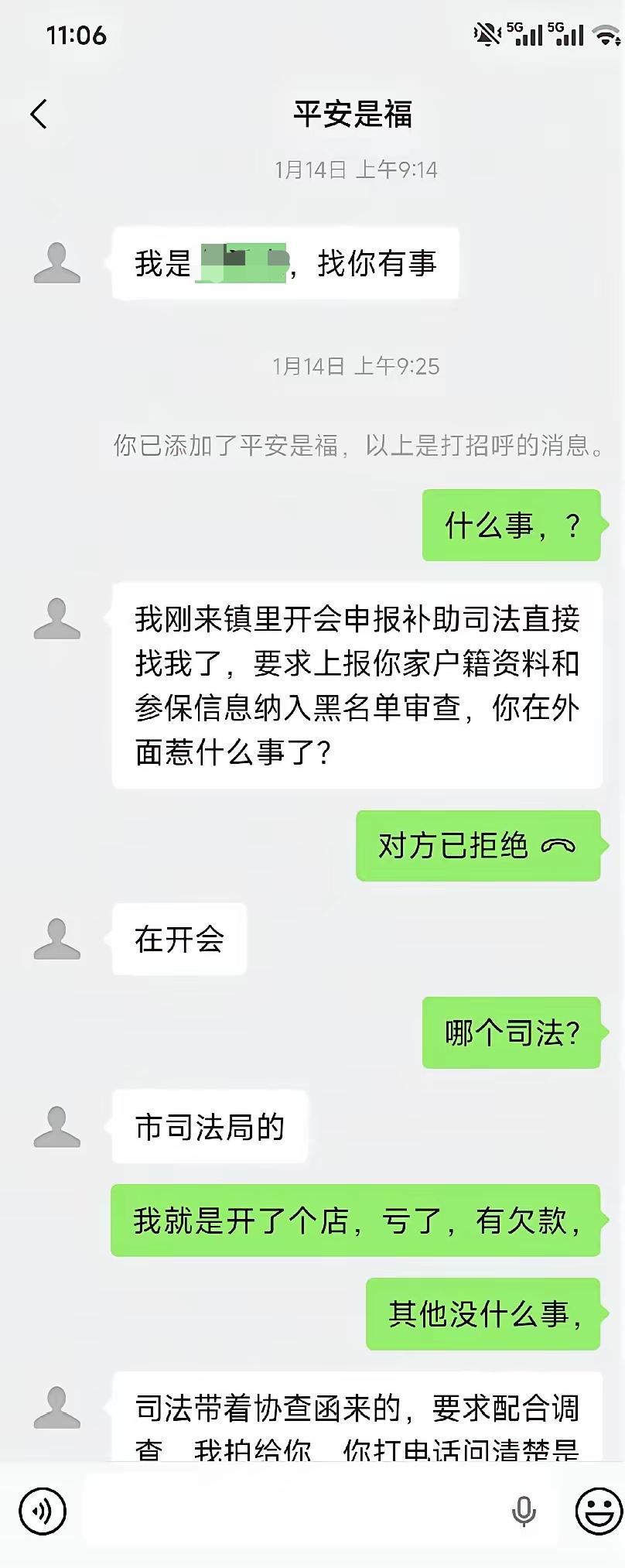近日,网友@心存善念 通过社交平台发布了一条动态,动态的内容“催收真恶心,冒充村支部书记联系我,我父母都七八十了,当时我吓的都浑身冷汗了,天杀的催收。”在这条动态下,还发布了两张微信聊天的截图,在截图中看到,微信很明显是刚刚添加的好友,而添加好友的内容是“我是董某某,找你有事。”,而这个董某某正是我们村里的支书,在通过好友之后,就询问什么事,而对方说,我刚来镇里开会申报补助,司法直接找我了,要求上报你家户籍资料和参保信息列入黑名单审查,你在外面惹什么事了。
