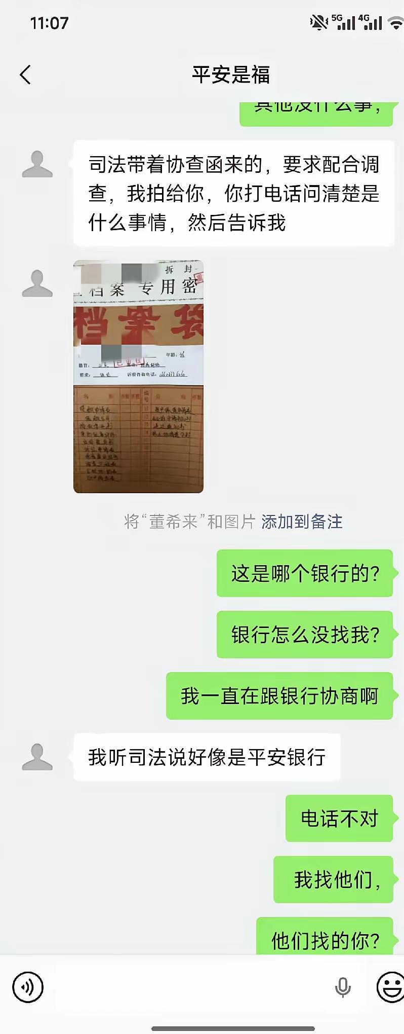 普法完成啦!我们接着说截图的内容,在截图中还看到了@心存善良 这位网友给对方拨打语音或视频聊天但被拒绝,对方声称是在开会,接着@心存善念 就询问那个司法,对方回答说是市司法局的,还称司法带着协查函来的,要求配合调查,我拍照给你,你打电话问清楚,接着就是一张类似文件的档案袋的照片,但没有发任何证件照片。