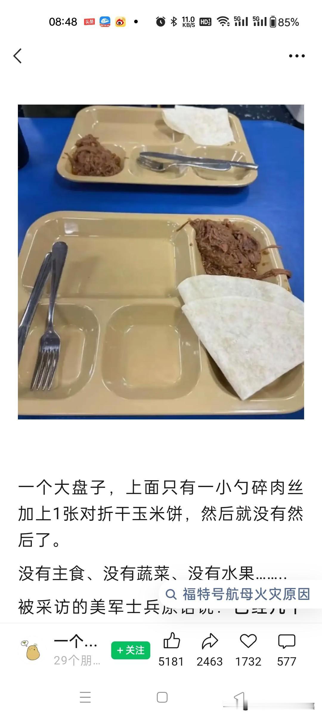 前面说美军航母下水道堵塞,洗衣房失火,现在又说航母上士兵饿肚子。