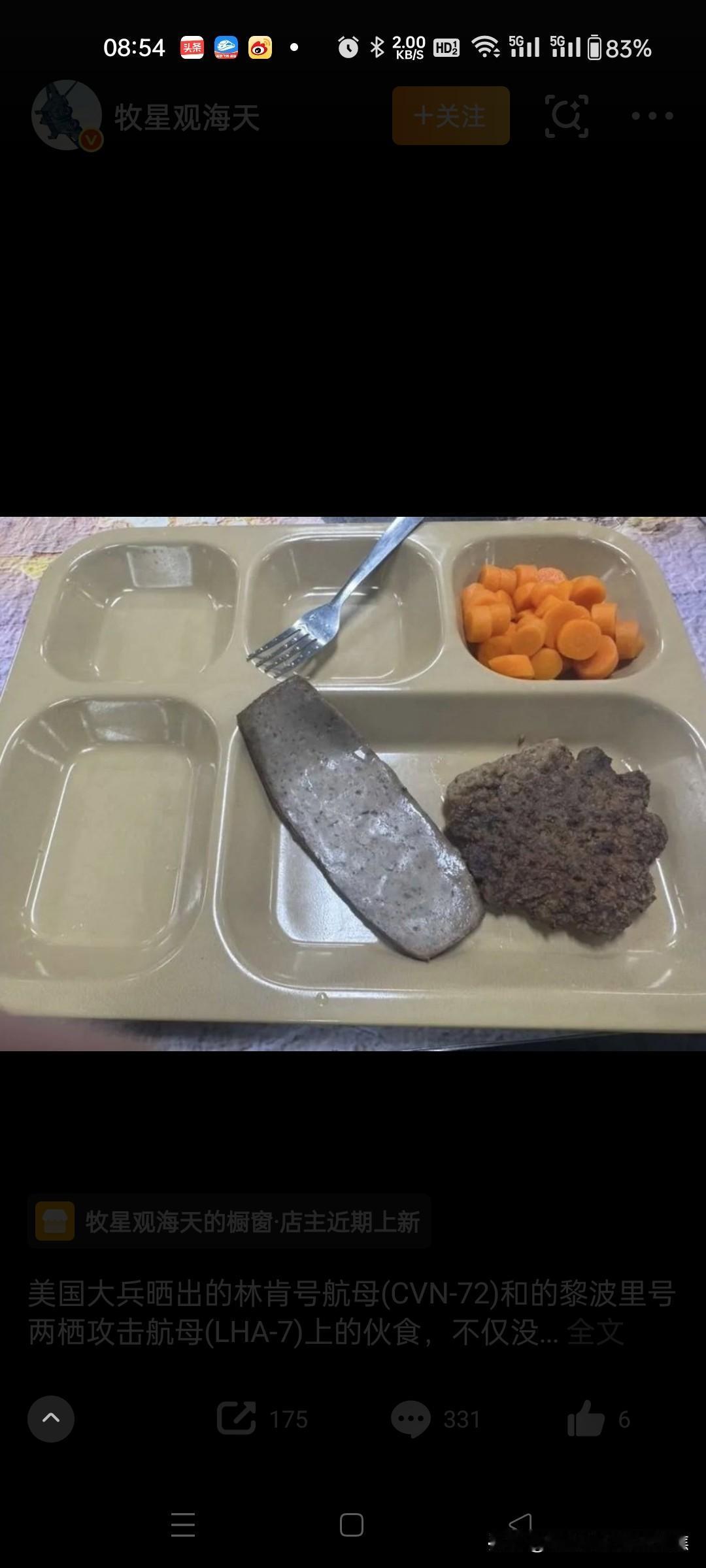 “林肯号”航母的晚餐只有少量煮胡萝卜、一块干肉饼及灰色加工肉片,士兵称食物“难以下咽”,甚至调侃“不如宠物粮”。