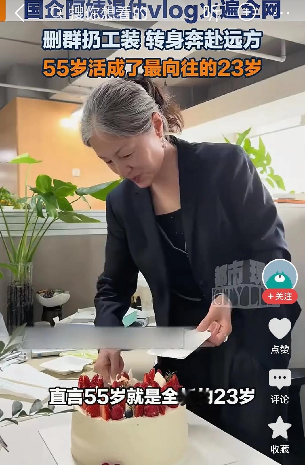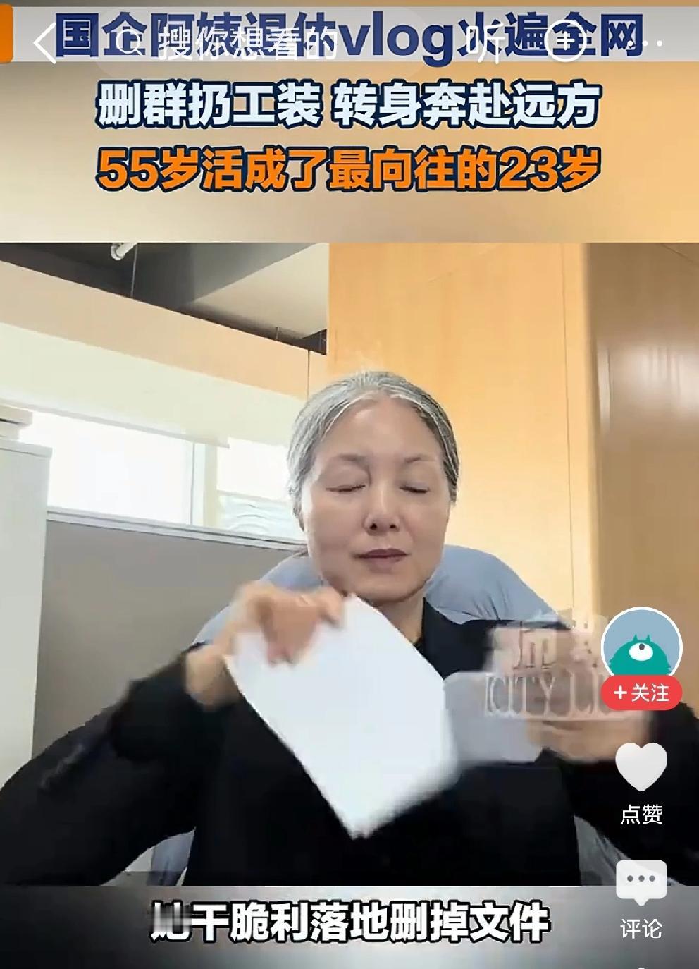 之后她删文件、退工作群、扔工装,称“55岁就是全新的23岁”。