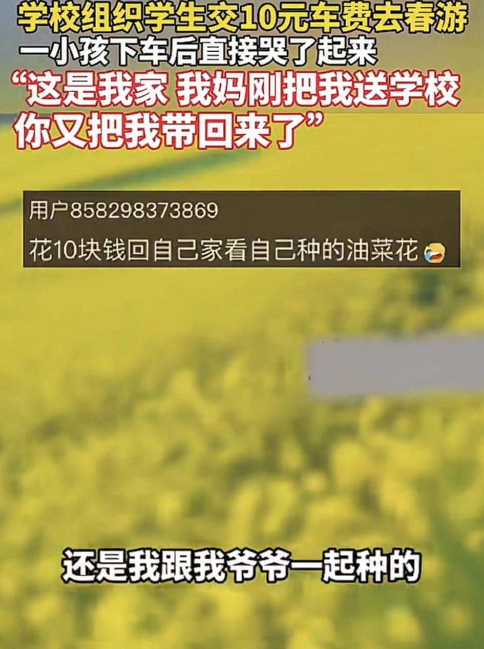 笑不活了,山东,一学校组织学生春游,安排的是每人交10元车费,乘车去乡间看油菜花,可来到目的地后,孩子们都开心又兴奋的下车看油菜花了,唯独一个男孩下了车时,往周围瞅了一眼后就哇大哭了起来。老师见状也是吓得赶紧上前询问孩子情况“你怎么了”,结果孩子这才跟老师说:这是我家的油菜花,还是我跟我爷爷一起种的,我妈刚把我送学校,你又把我带回来了!