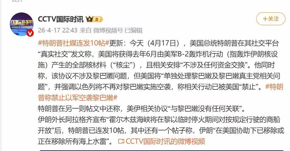 特朗普这波发文信息量太大了,但核心全是“胜利宣言”:宣称美国将免费拿到伊朗全部核材料“核尘”,不花一分钱;称伊朗在美国协助下已清除海上水雷,永久不会关闭霍尔木兹海峡;还放话美伊协议近在咫尺,双方已无任何障碍。