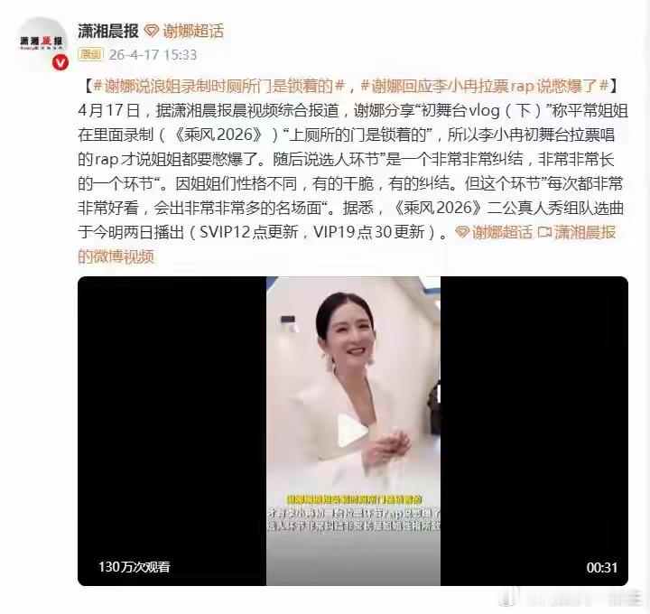谢娜爆料浪姐录制时厕所门是锁的谢娜在《乘风2026》初舞台Vlog里的一句随口爆